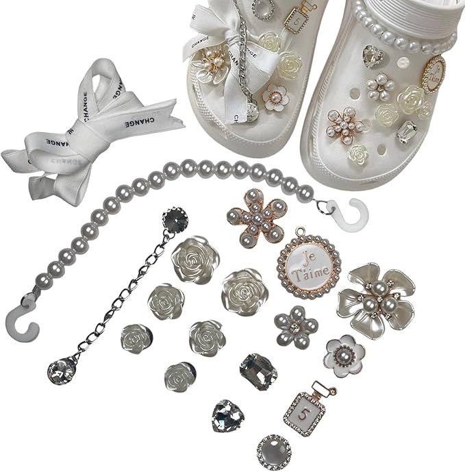 ホワイト リボン フラワー パール チェーン 18個