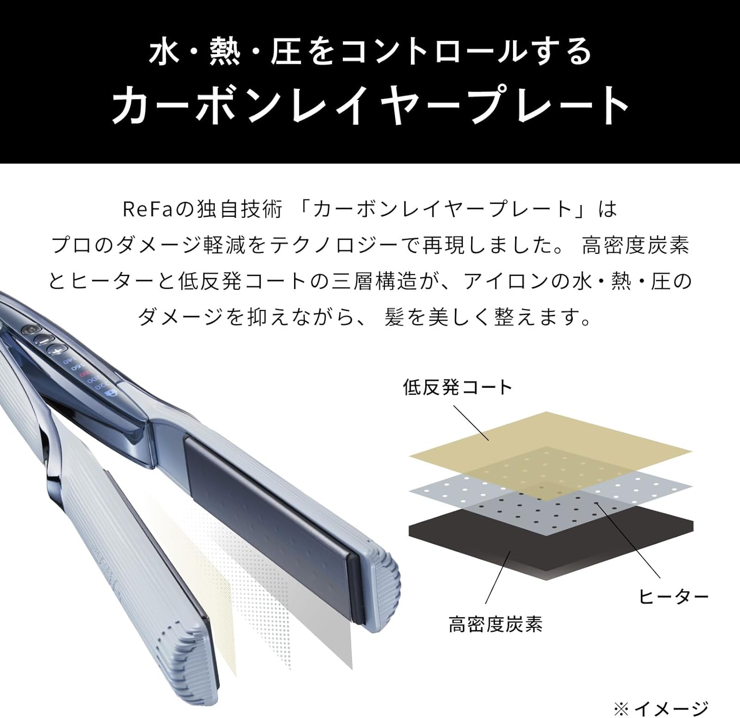 カーボンレイヤープレートの表面に施した低反発コートが髪にやさしく密着。