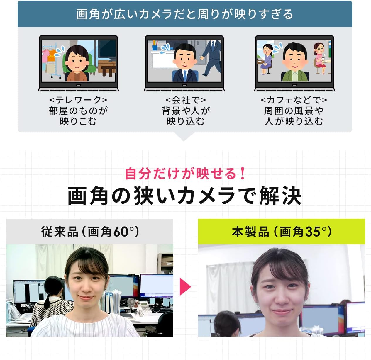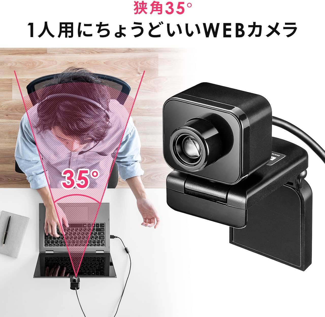 画角が35度の 狭角 WEBカメラ です。画角が広いカメラと比べて周りが映りすぎることなく、自分だけを映すことが可能です
