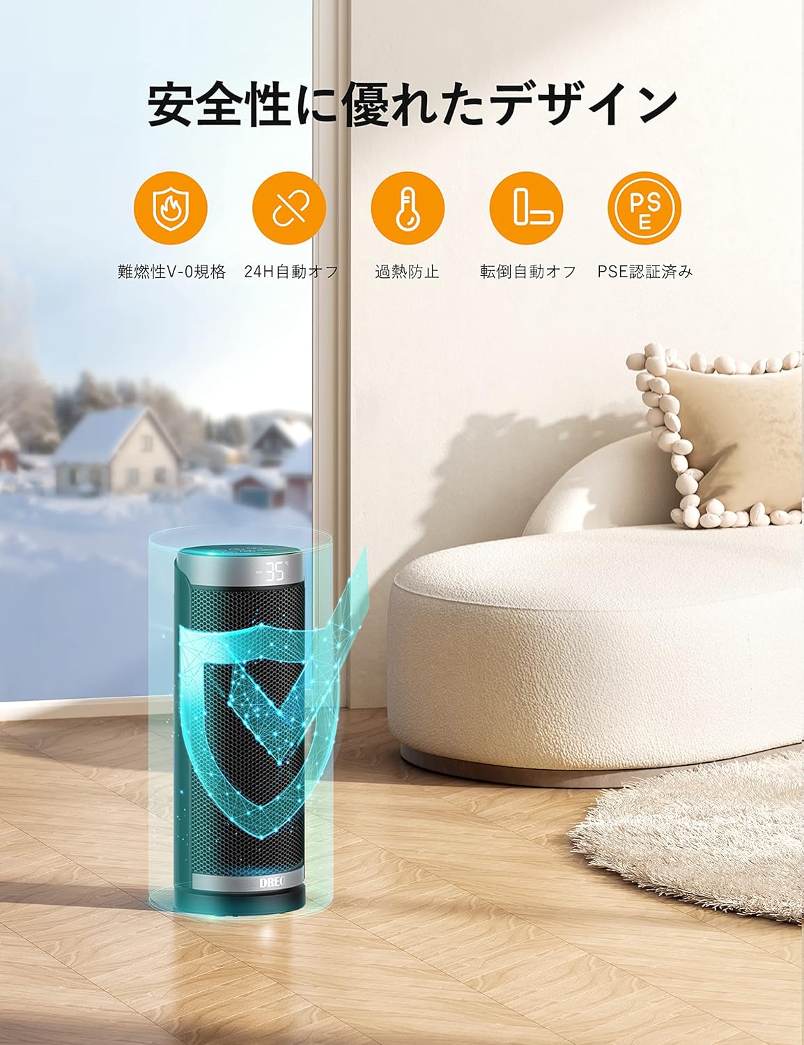2秒速暖 5種モード 70°首振り リモコン操作 暖房器具 12時間タイマー 転倒自動OFF