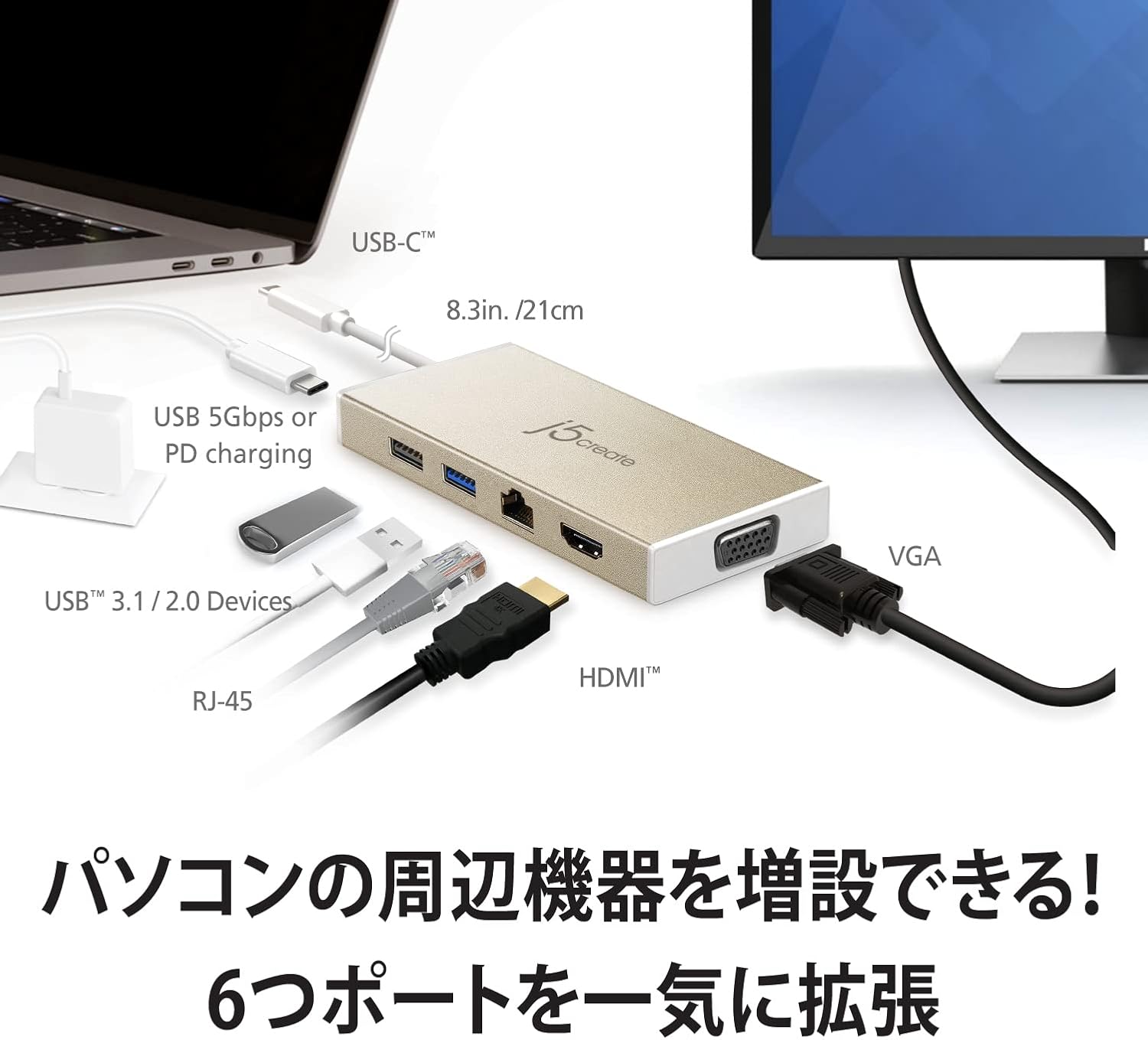 MacBookのようなType-Cを備えたノートPCに一気に6ポートを増設できるマルチアダプター