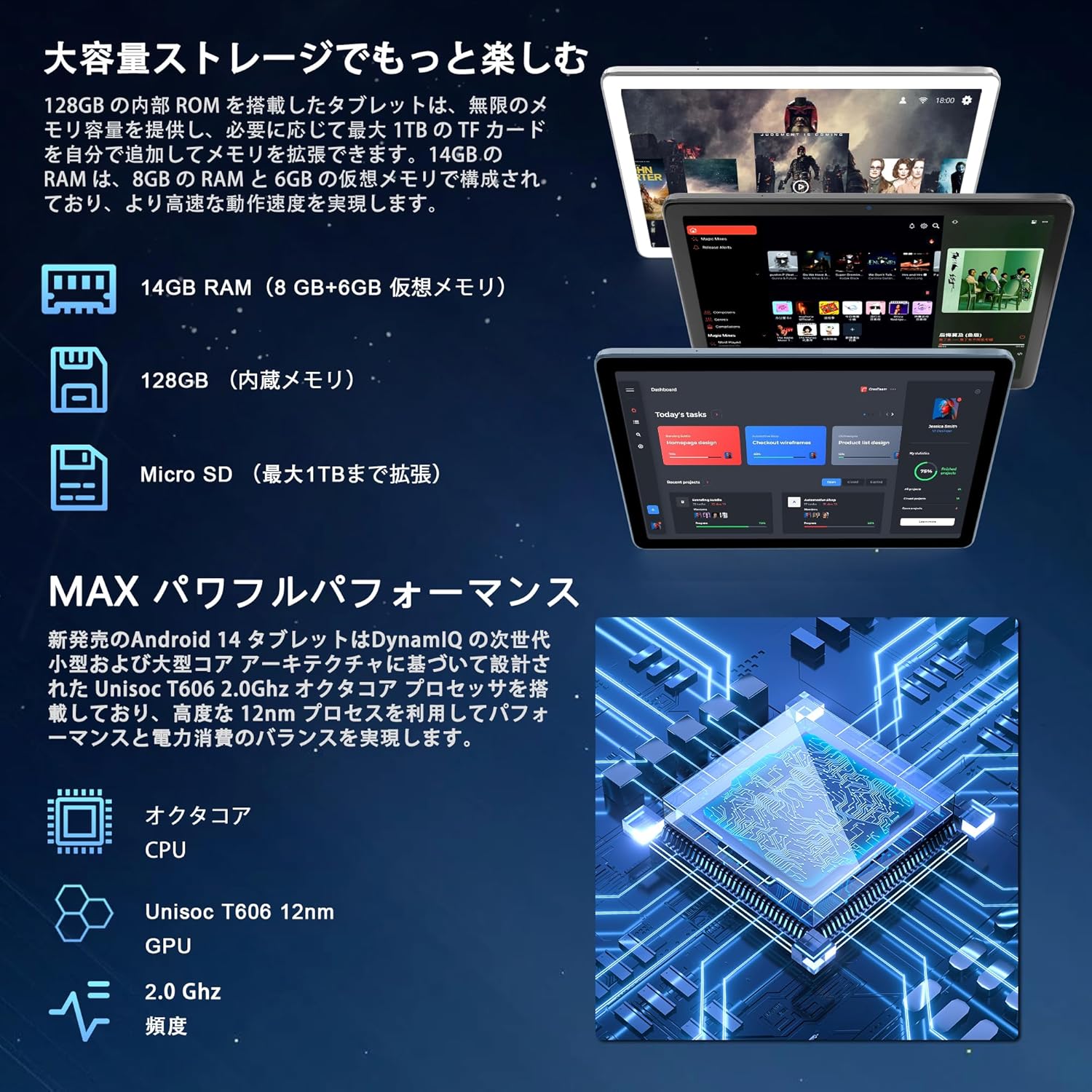 14GB+128GB+1TB拡張 4G LTE通話+5G/2.4G WIFI アンドロイドタブレット8コアCPU T606 8000mAhバッテリー