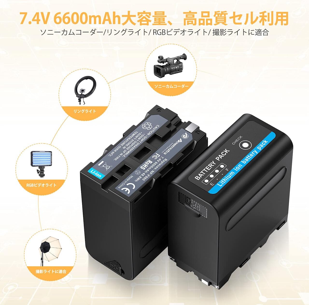 6600mAh Sony NP F970,F750,F960,F530,F570,CCD-SC55,TR516,TR716などに対応ビデオライト