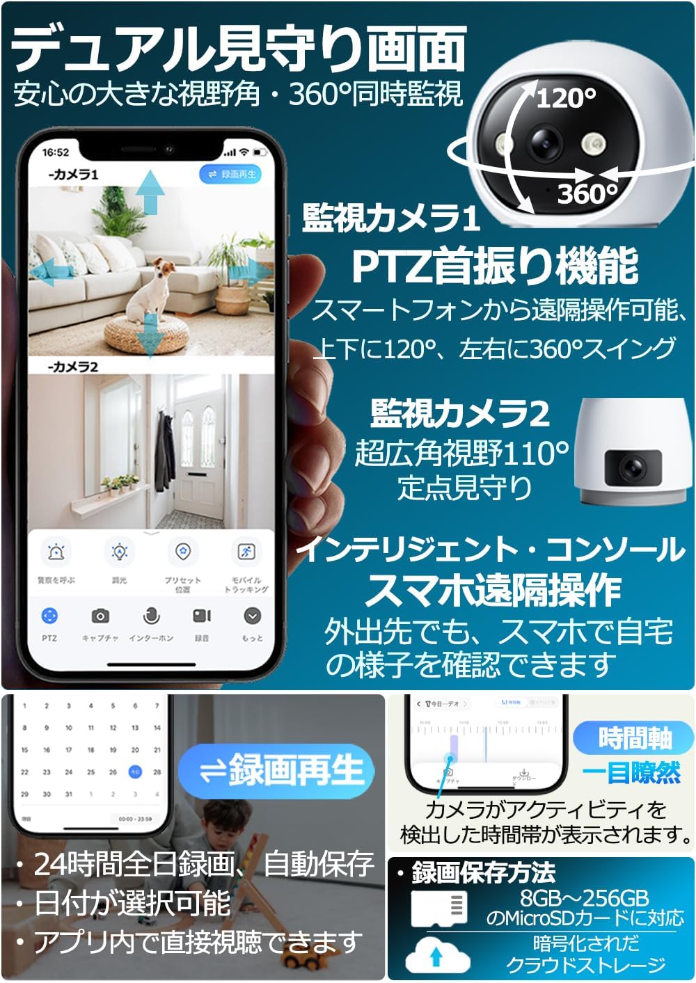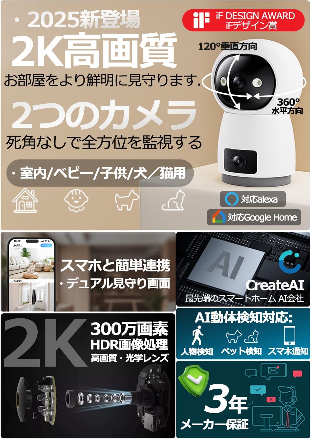 ペットカメラ iphone対応 2K・300万画素 見守りカメラ スマホ対応 防犯カメラ 360°全方位同時監視 ネットワークカメラ ペットみまもり 室内カメラ AI動作検知 自動追尾 スマホ通知 警報通知 監視カメラ 日本製 夜視フルカラー 双方向会話 常時録画 人気家庭用 犬 猫 ペット 高齢者 子供 小型 みまもりカメラ