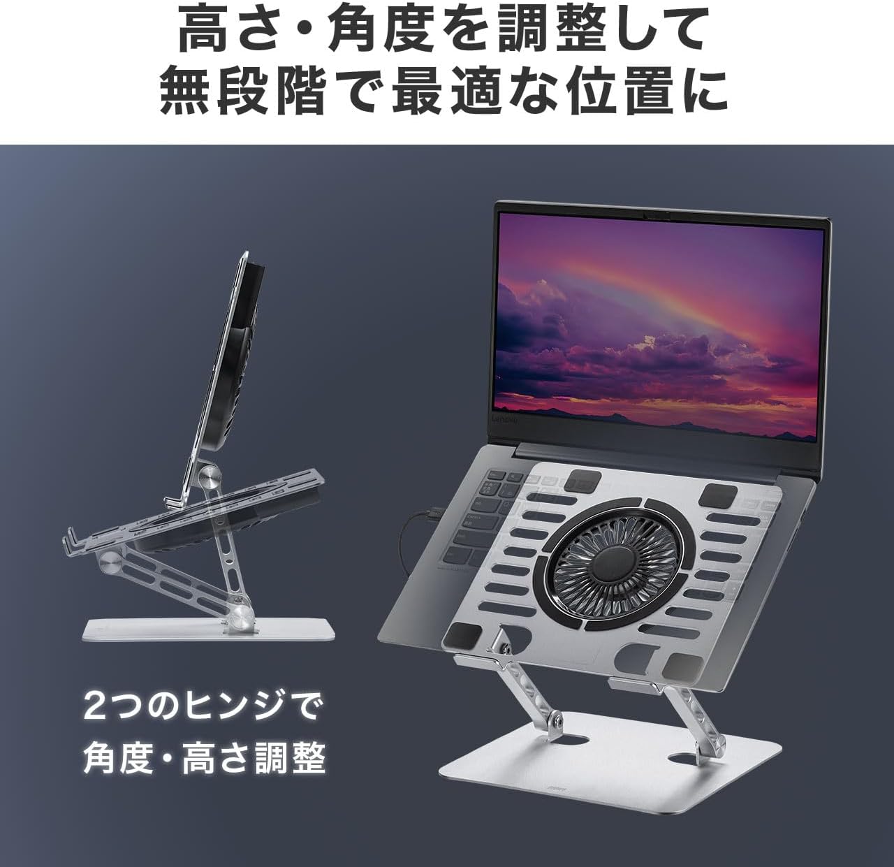 冷却台 アルミ 静音 無段階 角度調節 高さ調整 15.6インチ対応 USB2ポートUSB給電