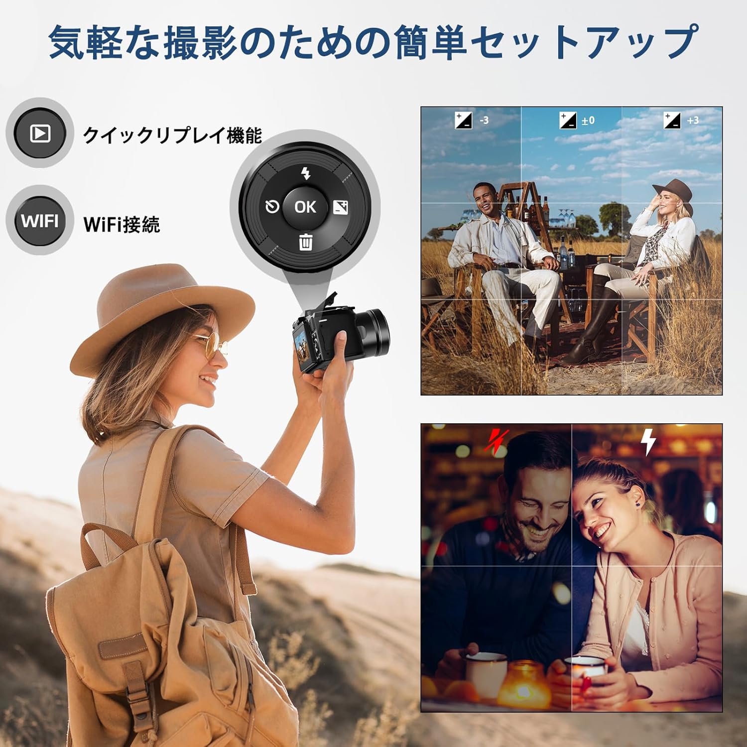 フリップスクリーン、16Xデジタルズーム、WIFI&オートフォーカス、カメラマイク&三脚、2バッテリー、32GB TFカード(Black)