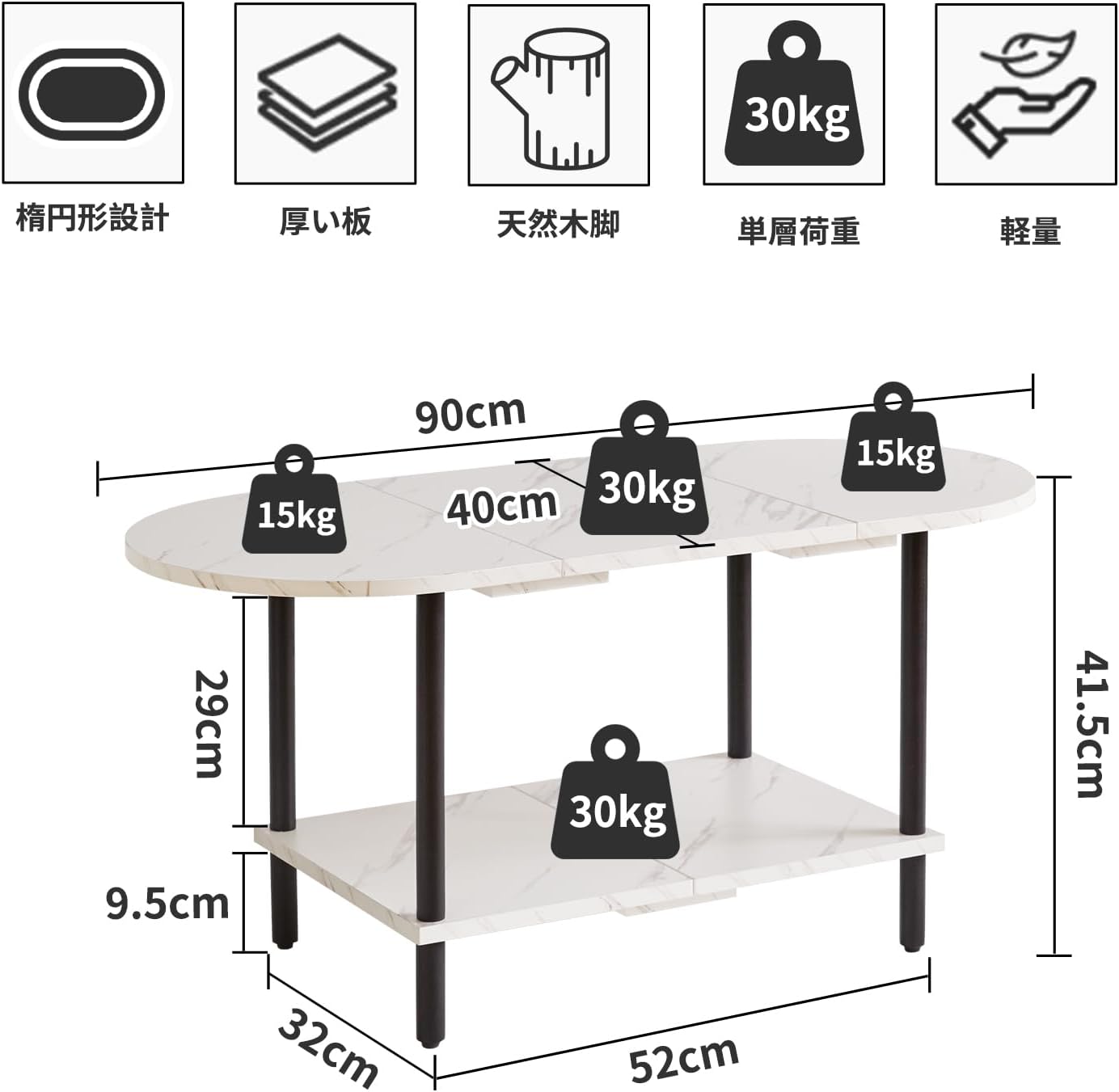 テーブル木製 センターテーブル 可愛い 楕円形 収納棚付き リビング ルーム テーブル 木質 90x40x42cm 軽量 組み立てが簡単 白い大理石模様天板+黒い脚 YD-011M