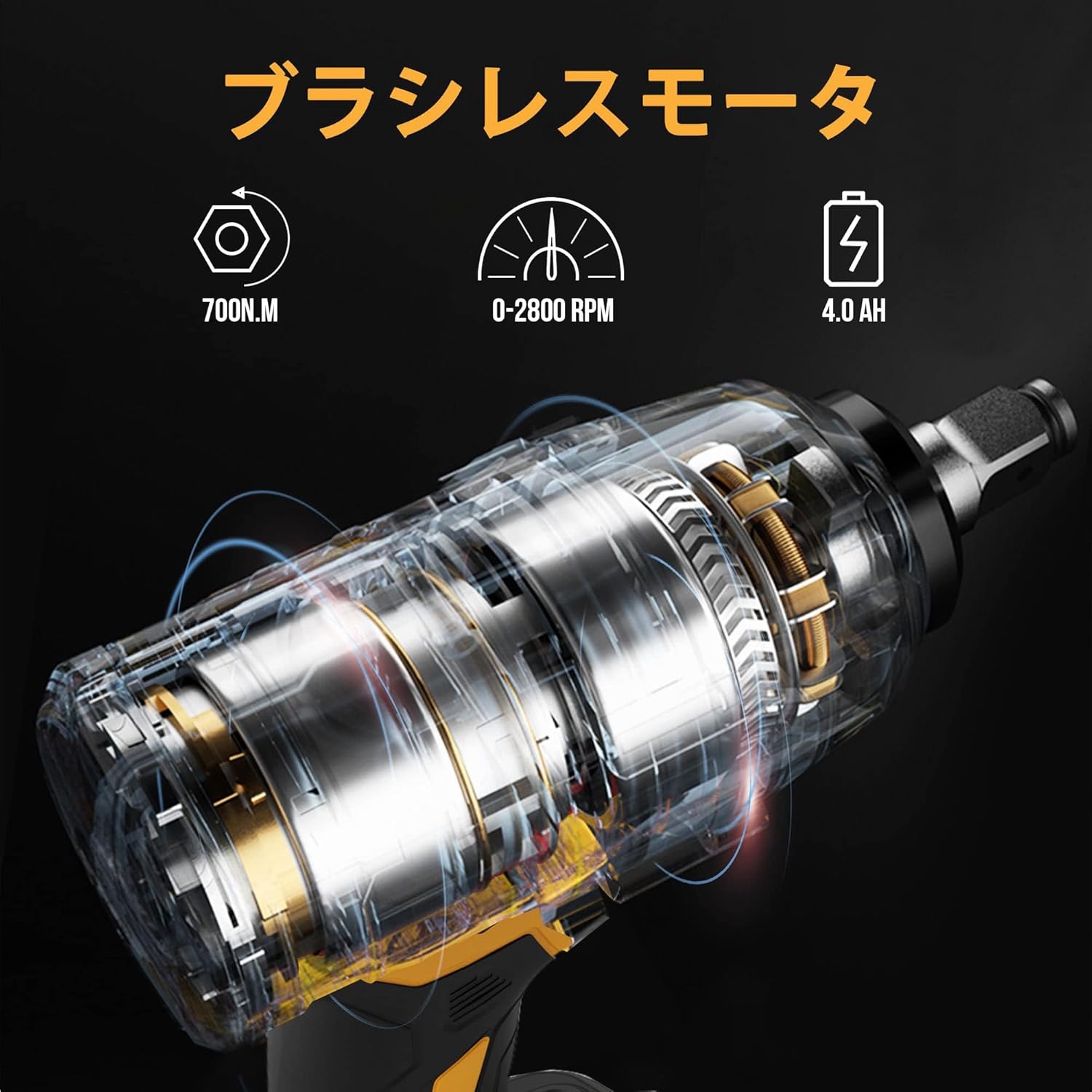 ブラシレスコンパクト最大700N.m高トルク電動インパクトレンチ4.0Ahリチウムイオンバッテリー