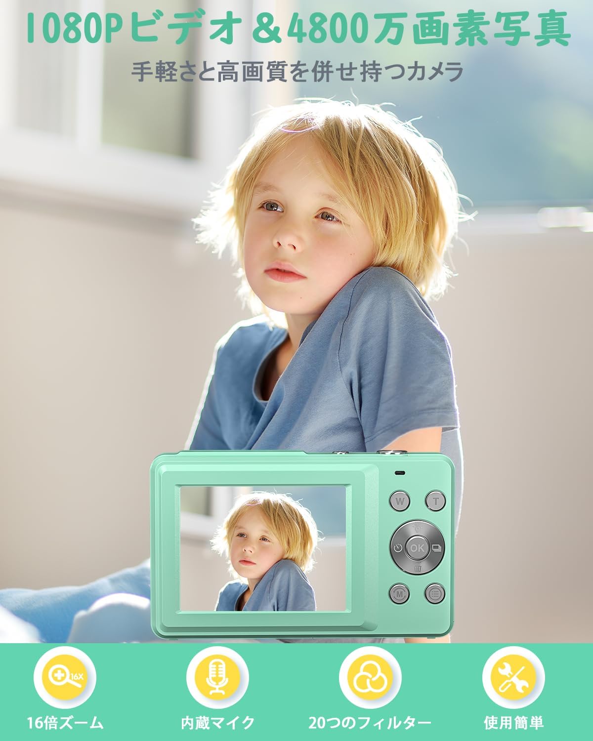 デジカメ 4400万画素 1080p動画 16倍ズーム 2.4インチIPSスクリーン ビデオ録画 ウェブカメラ 多機能カメラ ストラップ付き 使いやすい 軽量 小型 子供の日 プレゼント (グリーン+32gメモリカード)