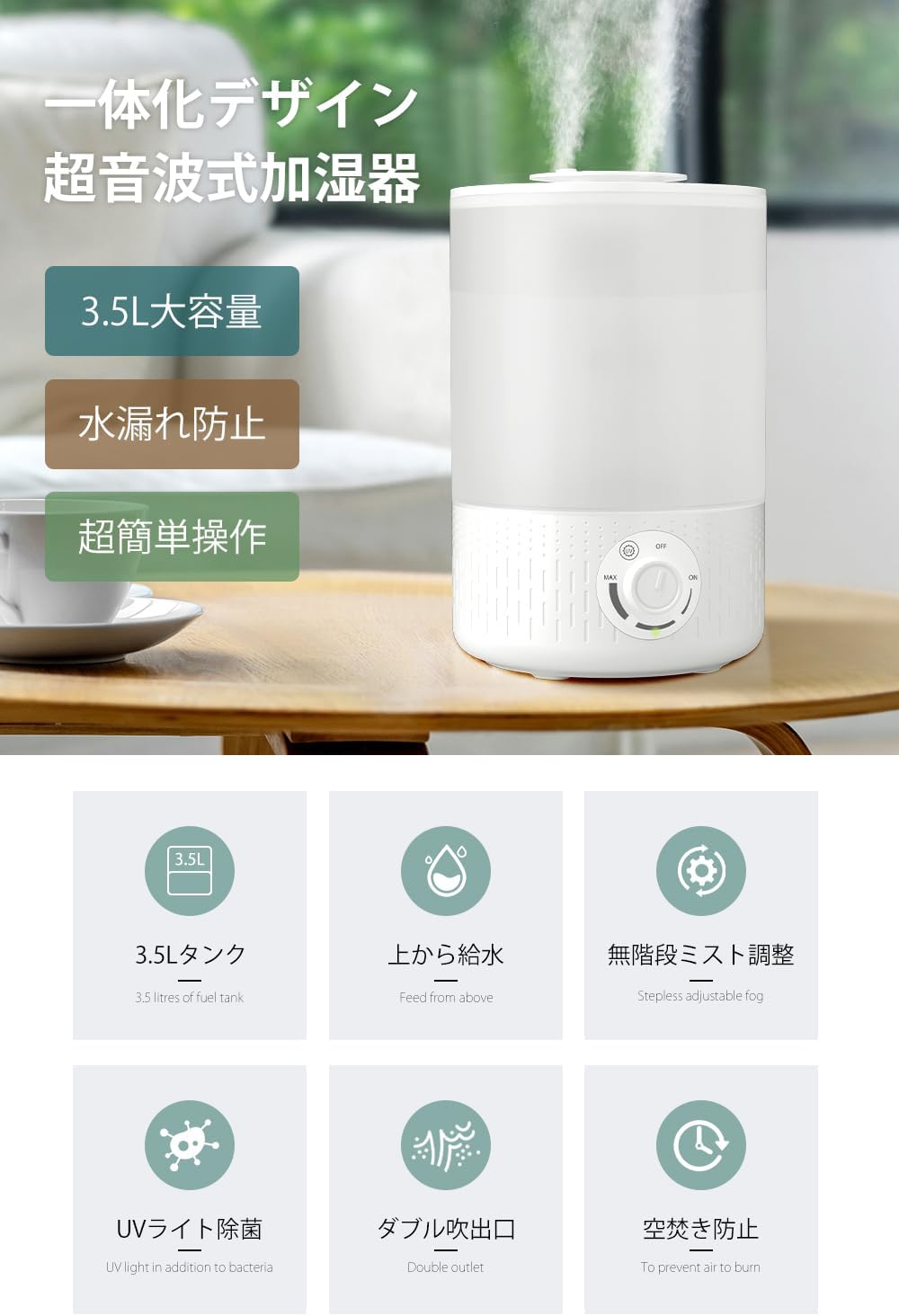 上から注水 かしつき 無階段ミスト調整 54時間連続作動 空焚き防止 水漏れ防止 吹出口360° 乾燥対策