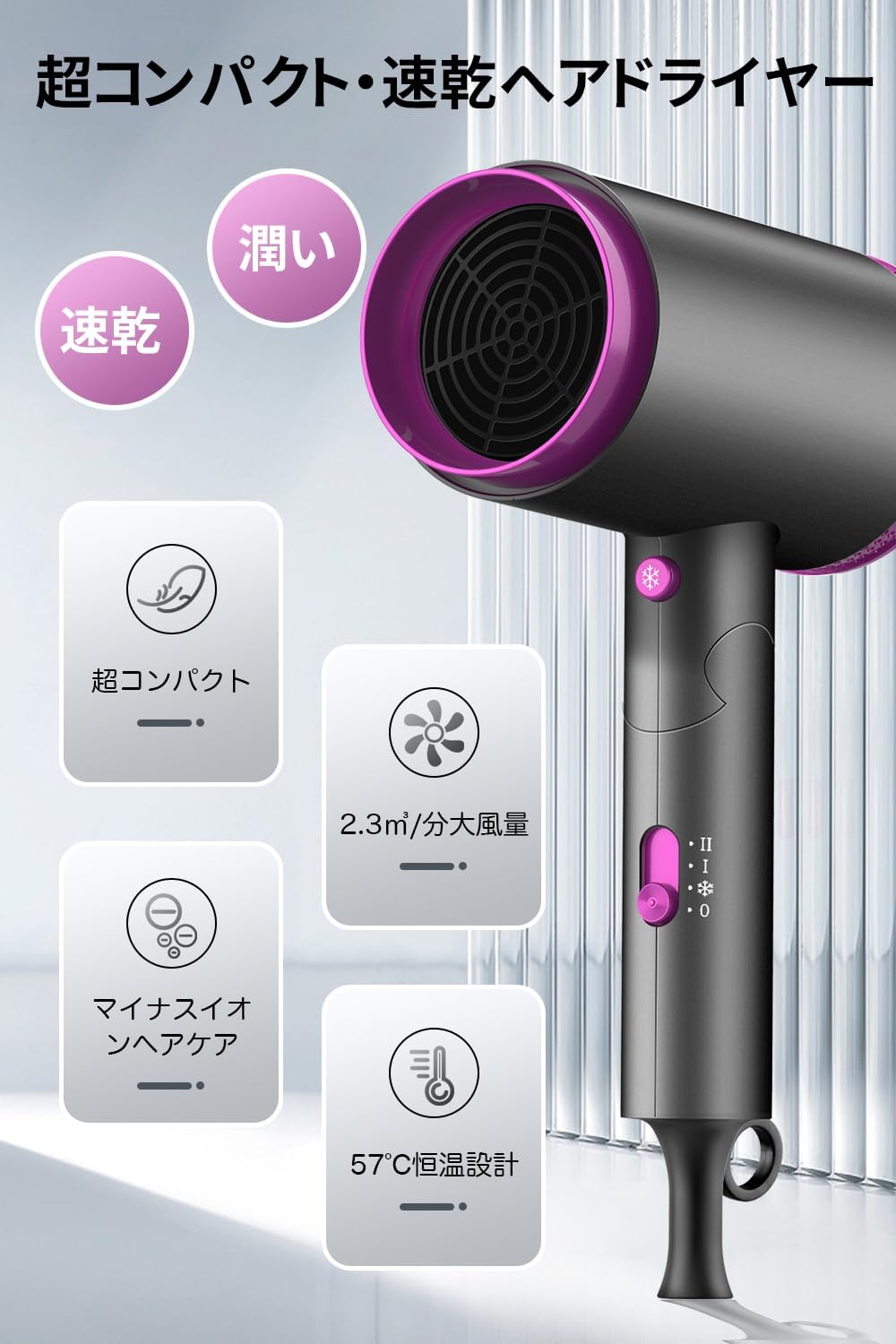 3段階調節 静音 小型 マイナスイオン ヘアケア 過熱保護 軽い 携帯ドライヤ
