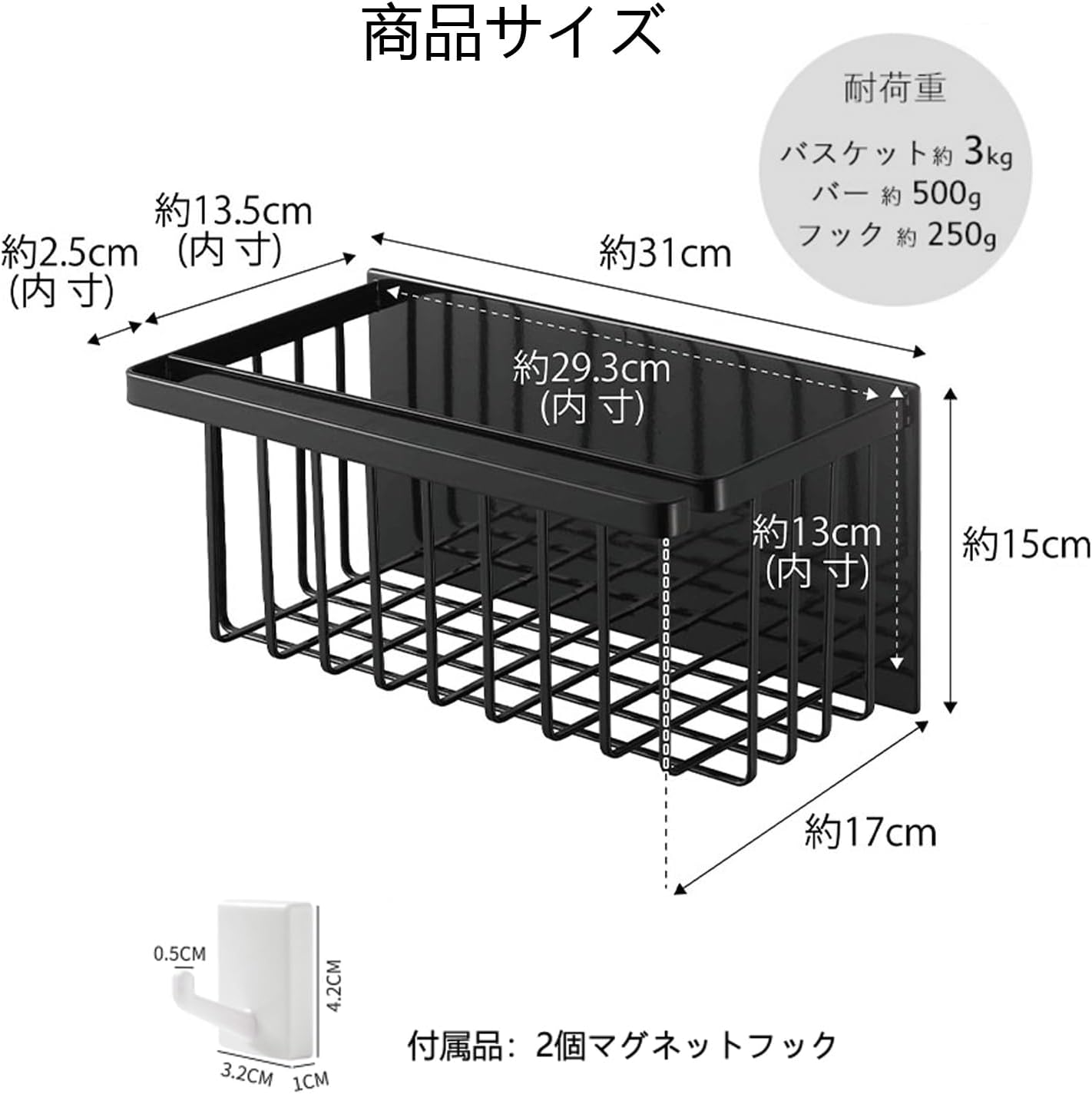 ワイド約W31XD17XH15cm tower浴室収納お風呂 キッチンラック冷蔵庫収納洗濯機置き場 付属2個フック2個マグネットフック (ホワイト, L)