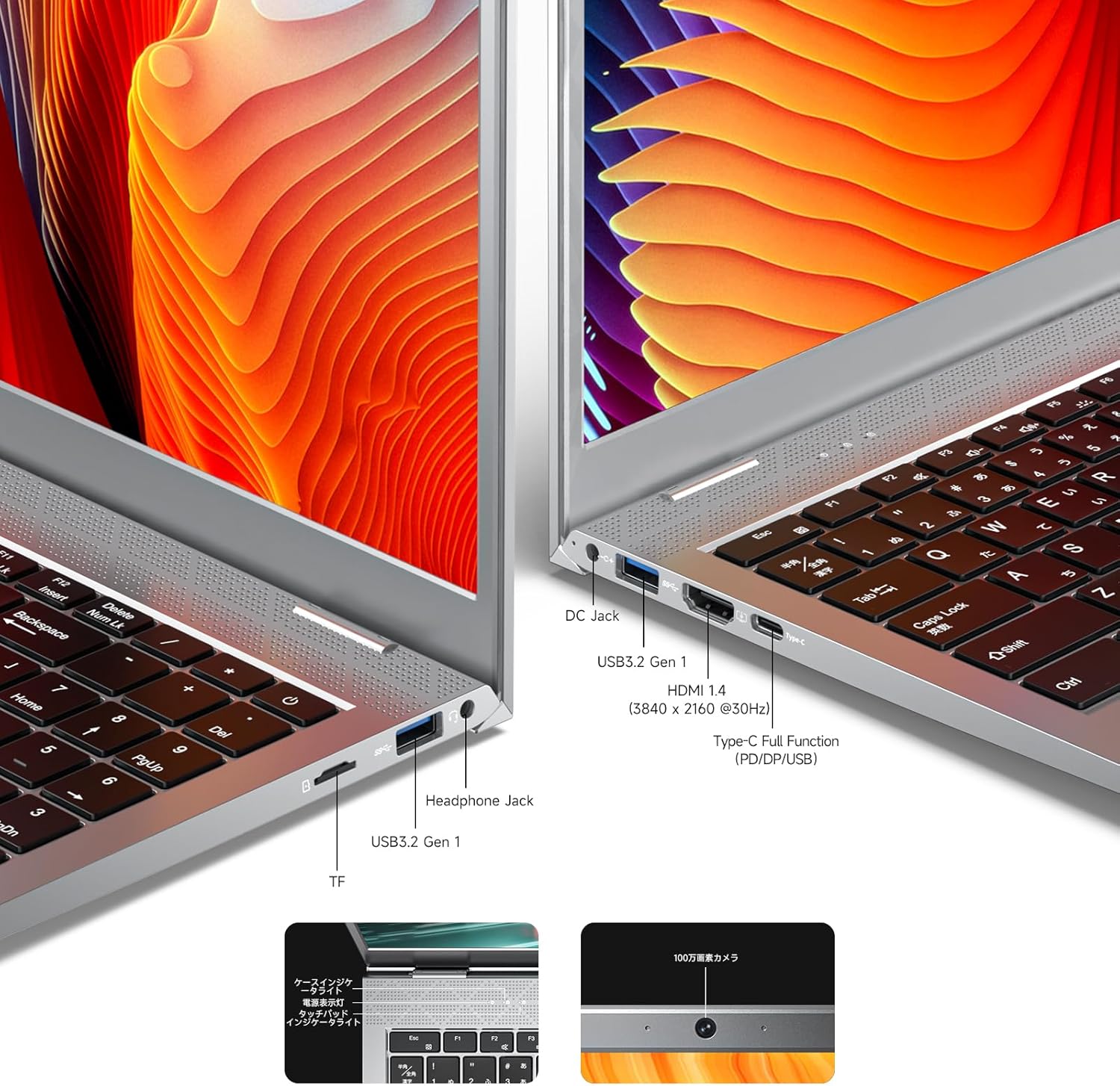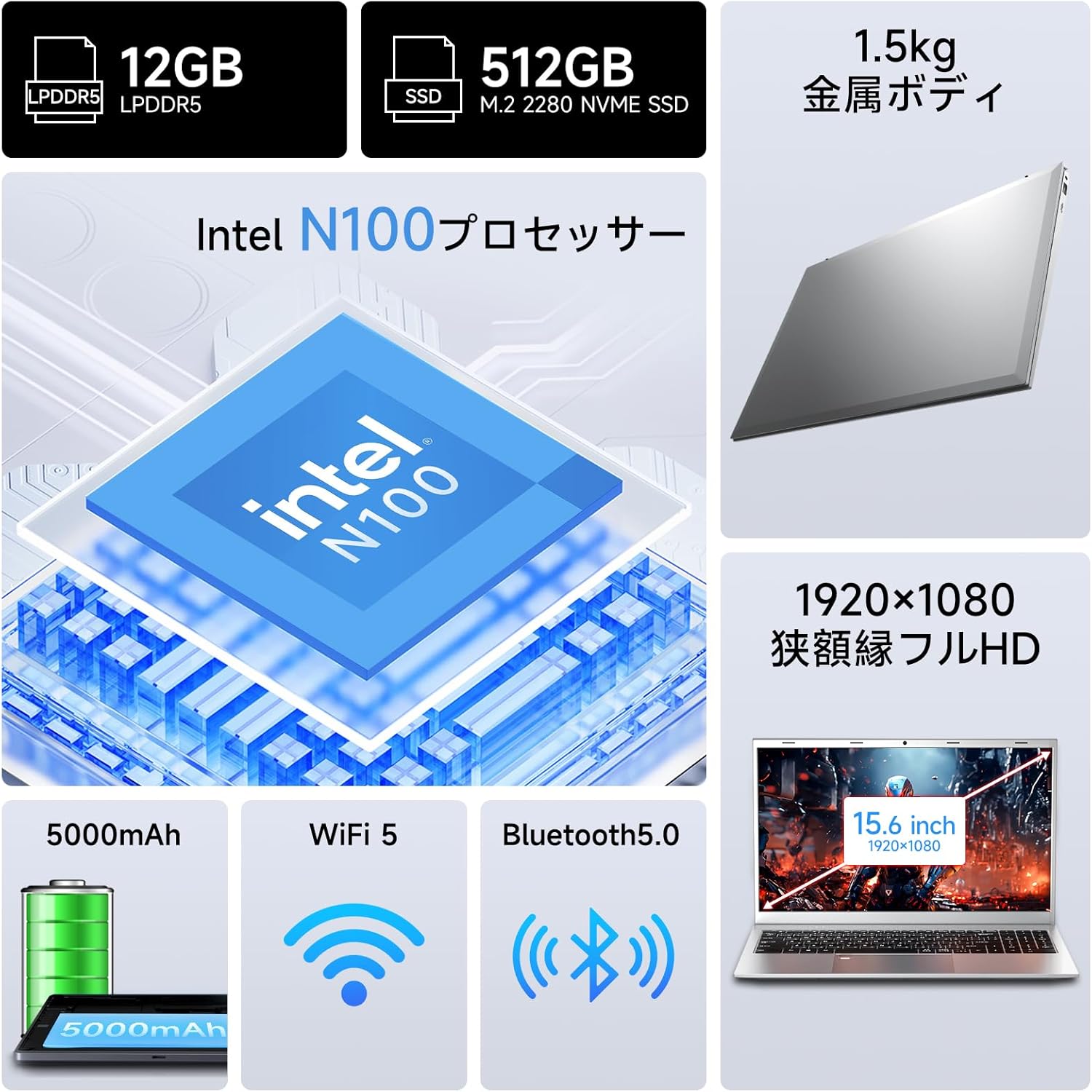 N100 薄型ノートPC 15.6インチ Windows 11 Pro対応 4C4T DDR5 12GB RAM
