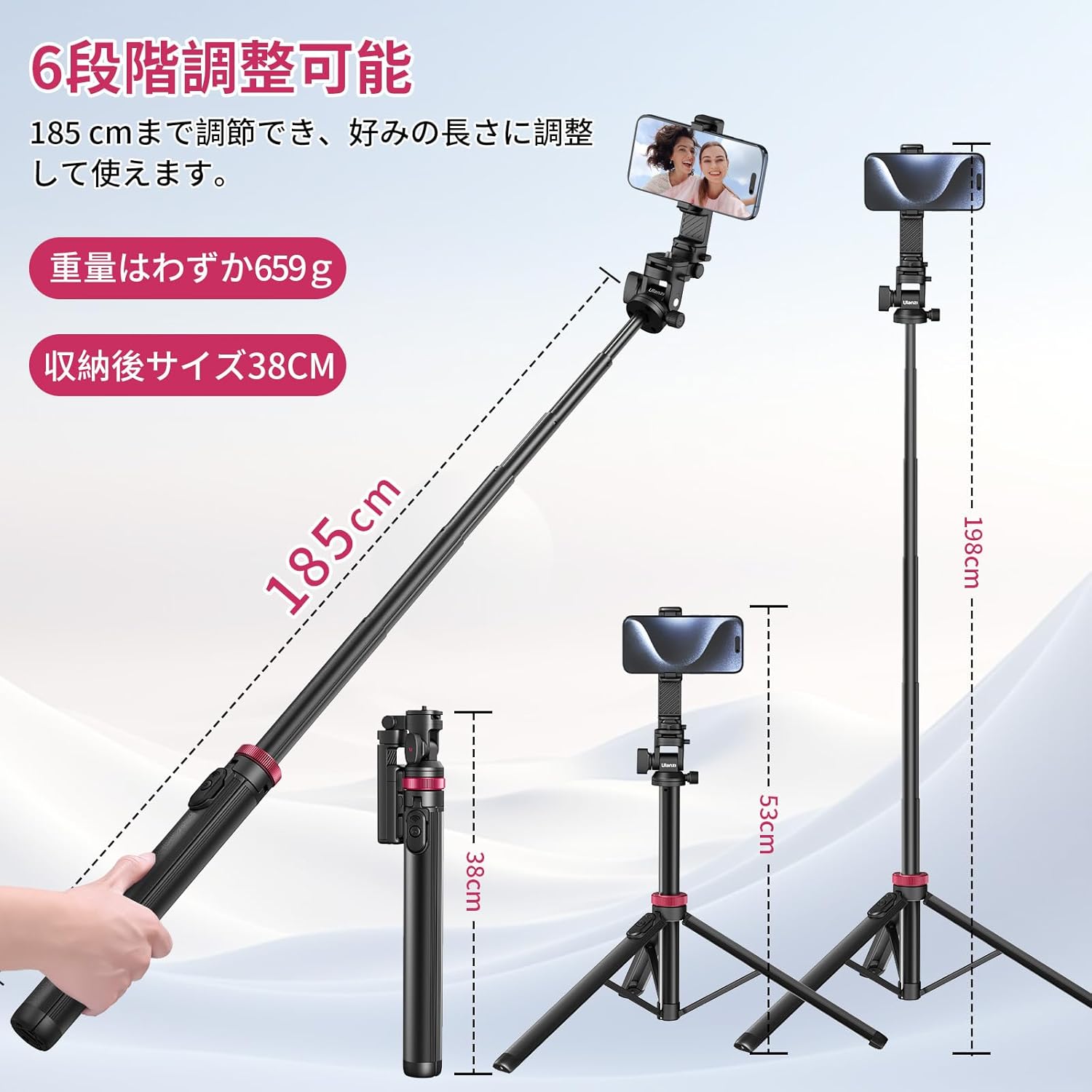 スマホグリップ付き 1/4ネジ付き 6段階伸縮じどり棒 iPhone Android対応 360°パノラマ撮影
