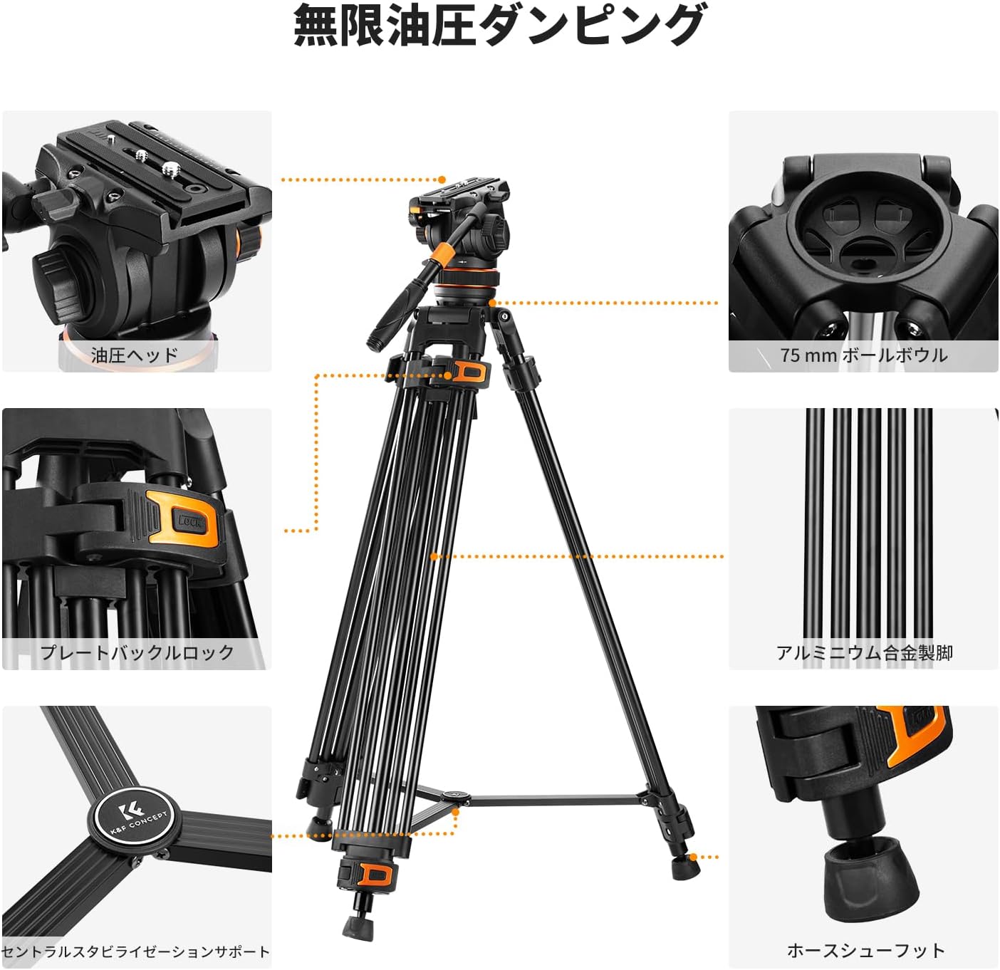 ConceptK&F Concept 75"/191cm ビデオ三脚、フルード雲台付き
