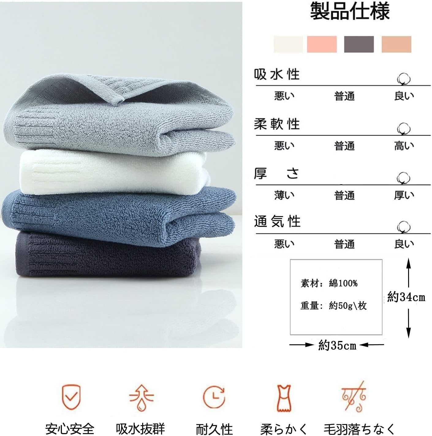 綿100% 家庭用 業務用 タオル 34cm×35cm 重さ約50g/枚 おしぼり 人気 ふんわり 柔らかな肌触り 瞬間吸水 速乾 (3色)