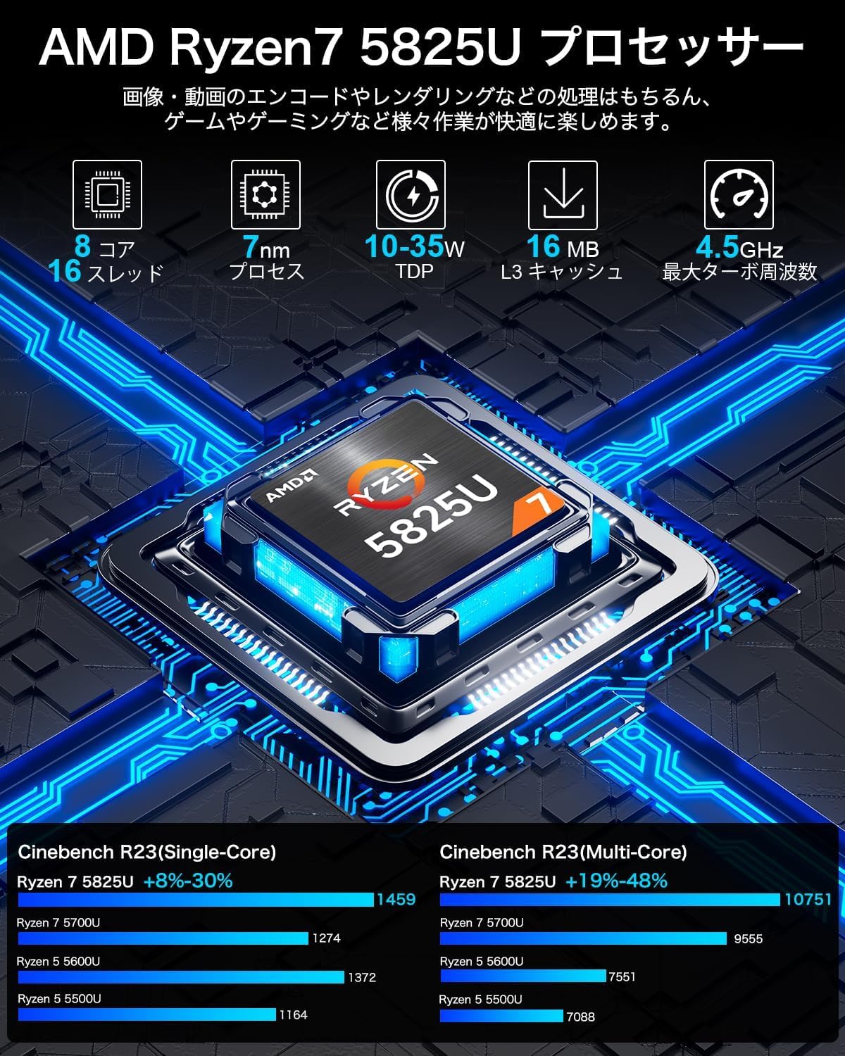 AMD Ryzen 7 5825U (8C/16T 最大 4.50GHz) ミニPC 16GB SSD 512GB Windows 11 Pro 3画面