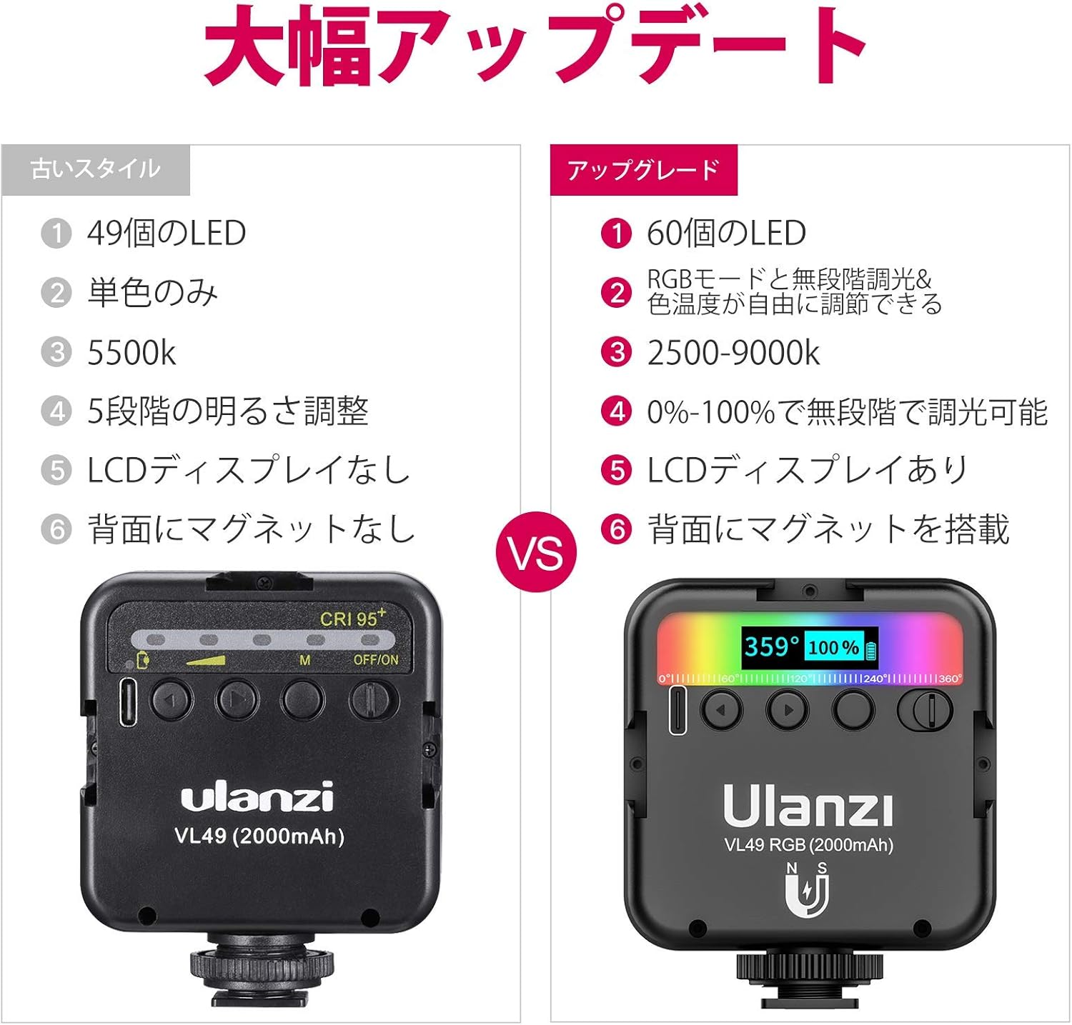 最新 Ulanzi VL49 RGB撮影ライト+三脚付き CM0519