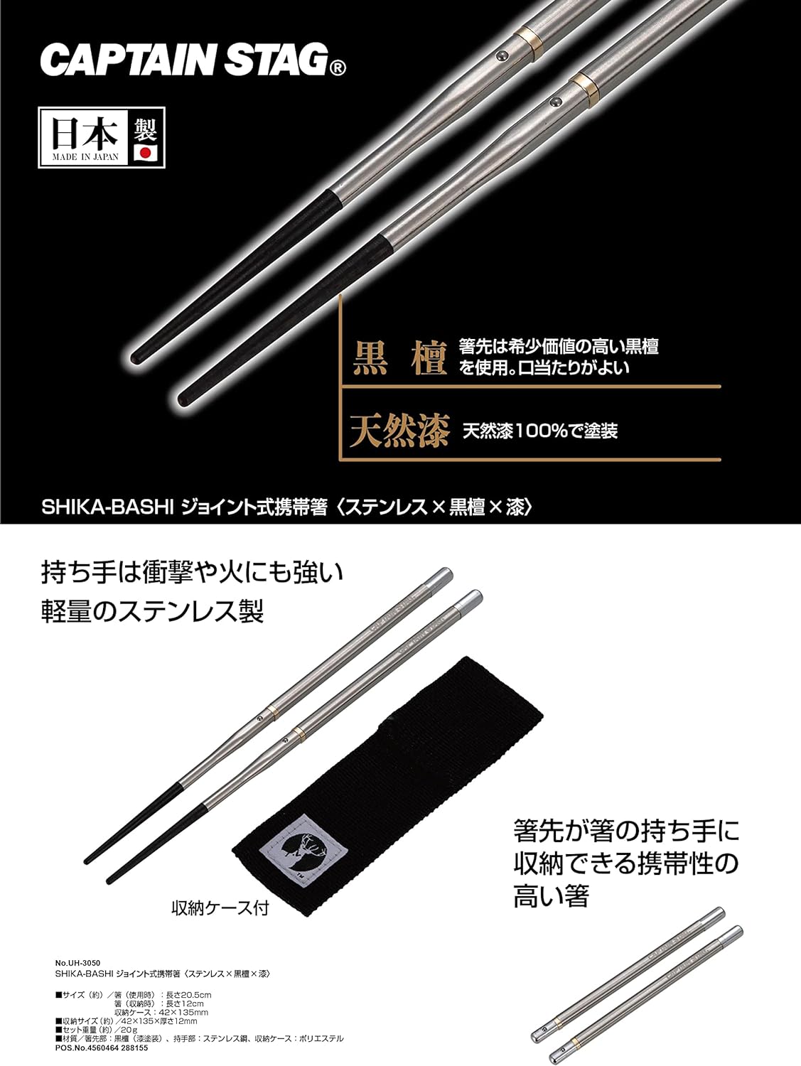 携帯箸 SHIKA-BASHI ジョイント式 ステンレス製 黒檀 漆 収納ケース付 日本製 UH-3050