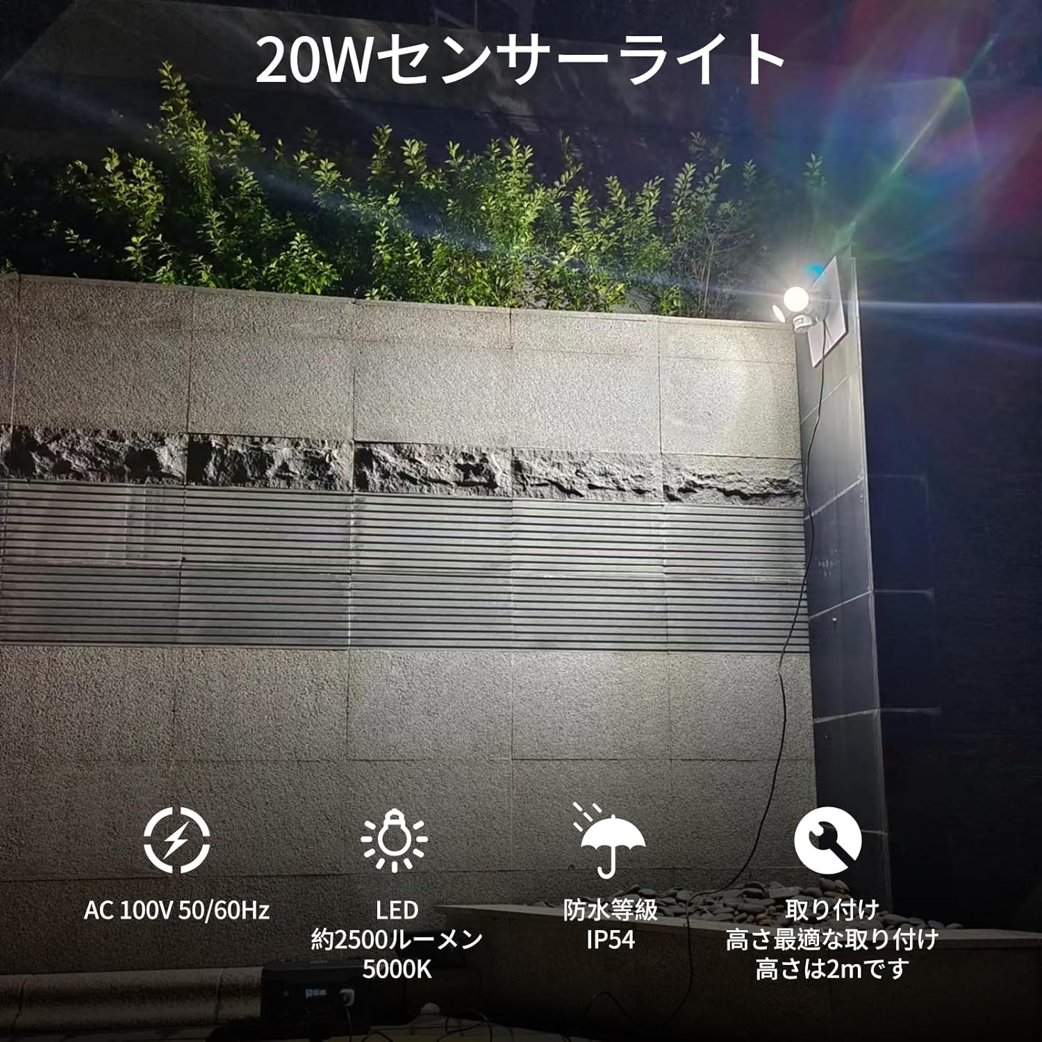 屋外用、コンセント式、明るさ2500ルーメン、AC 100V 50/60Hz、IP54 防雨、電源コード5m