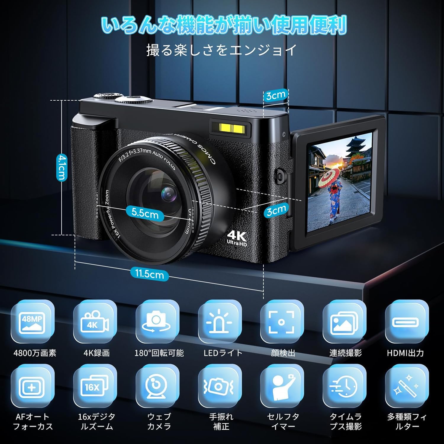4K デジタルカメラ 32GBマイクロSDカード付き オートフォーカス機能 180度回転可能ディスプレイ 4800万画素 16倍ズーム 手振れ補正 Webカメラ 自撮りカメラ 3インチ大画面 美顔フィルター 52mmUVフィルター付属 バッテリー2枚 子どもの日 新年 クリスマス 初心者向け バッテリー充電器付き