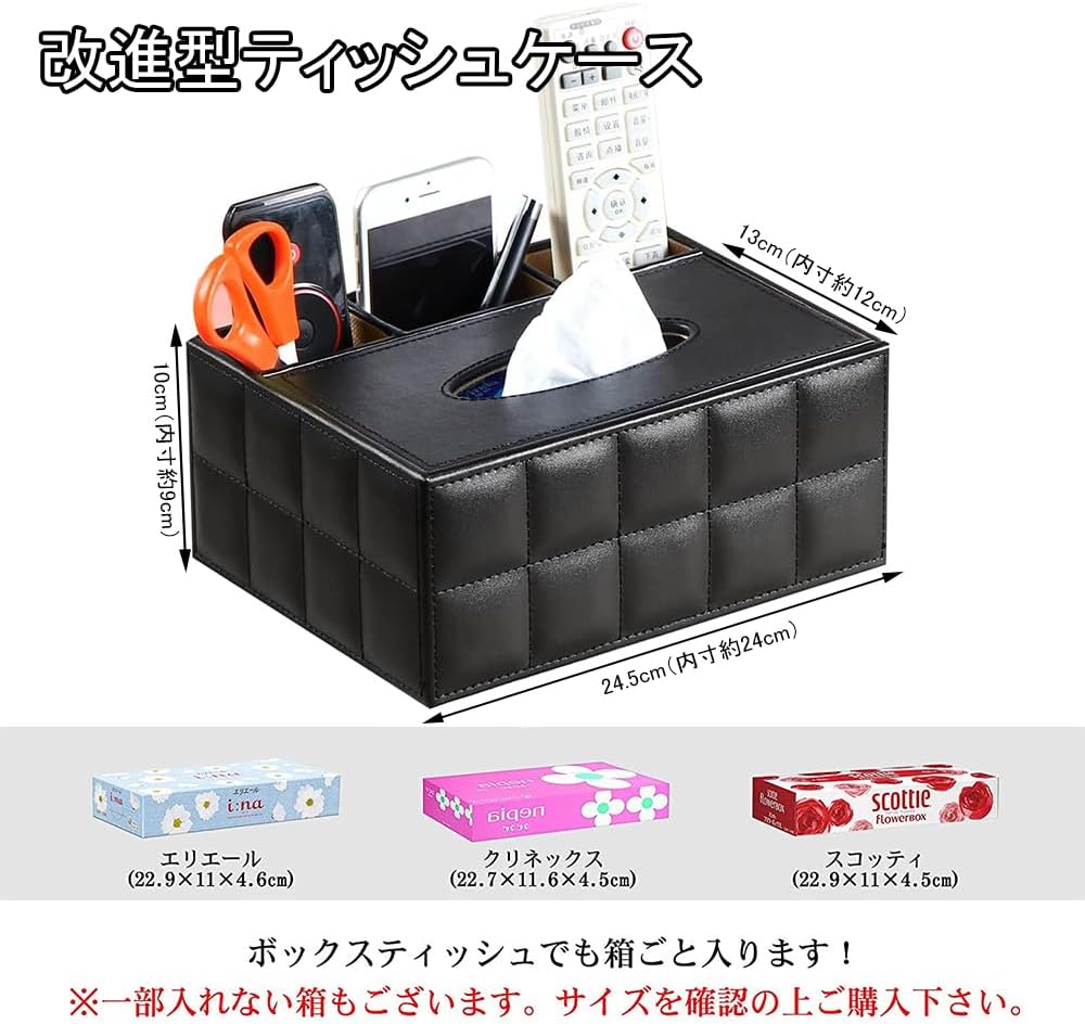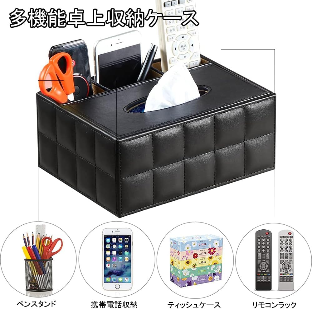 PUレザー製 多機能収納ケース ティッシュボックス・ホルダー ペン・鉛筆・リモコン収納 卓上収納 仕切り付き 小物収納 オフィス用 家庭用 (ホワイト格子)