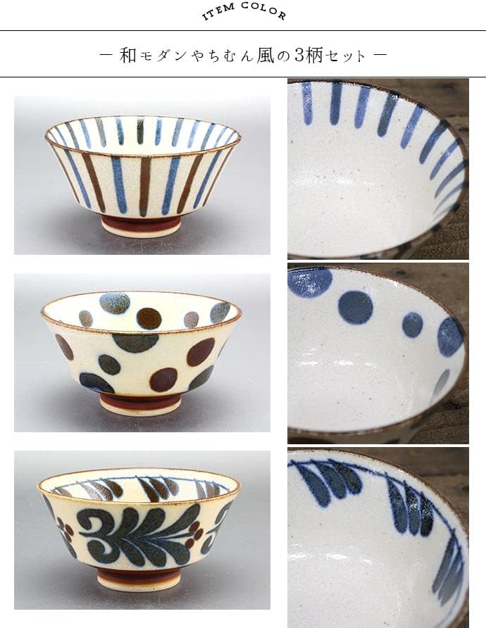 美濃焼 和モダンやちむん風飯碗 3柄セット 径13cm 3個