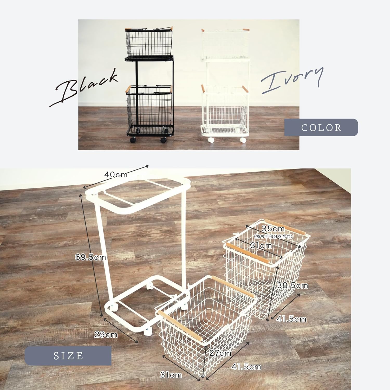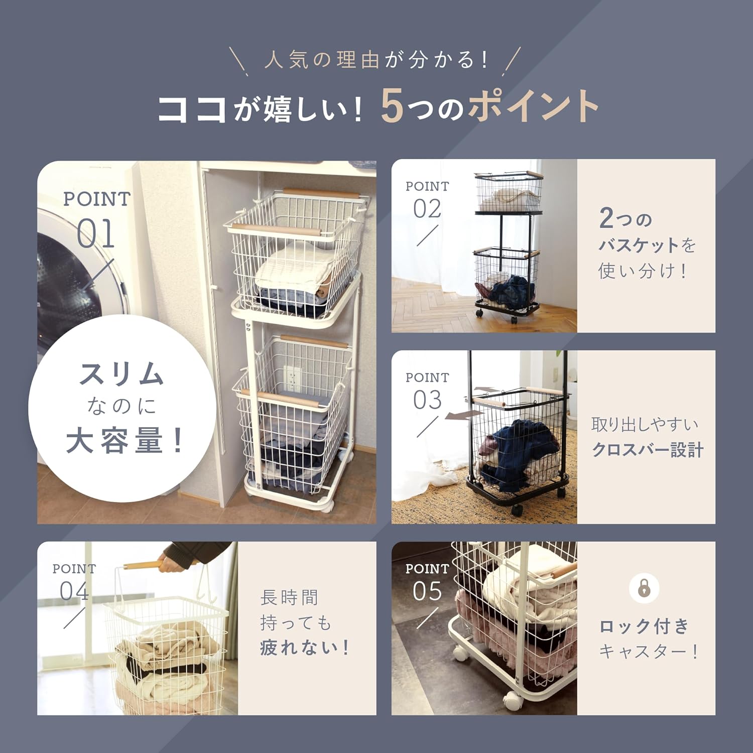 二段 洗濯かご 2段 かご ランドリー ランドリーワゴン+バスケット 3点セット ランドリー バスケット 2段 キャスター 持ち手付 分別可能 脱衣所 洗濯かご 簡単組み立て おしゃれランドリーワゴン 大容量(ホワイト)