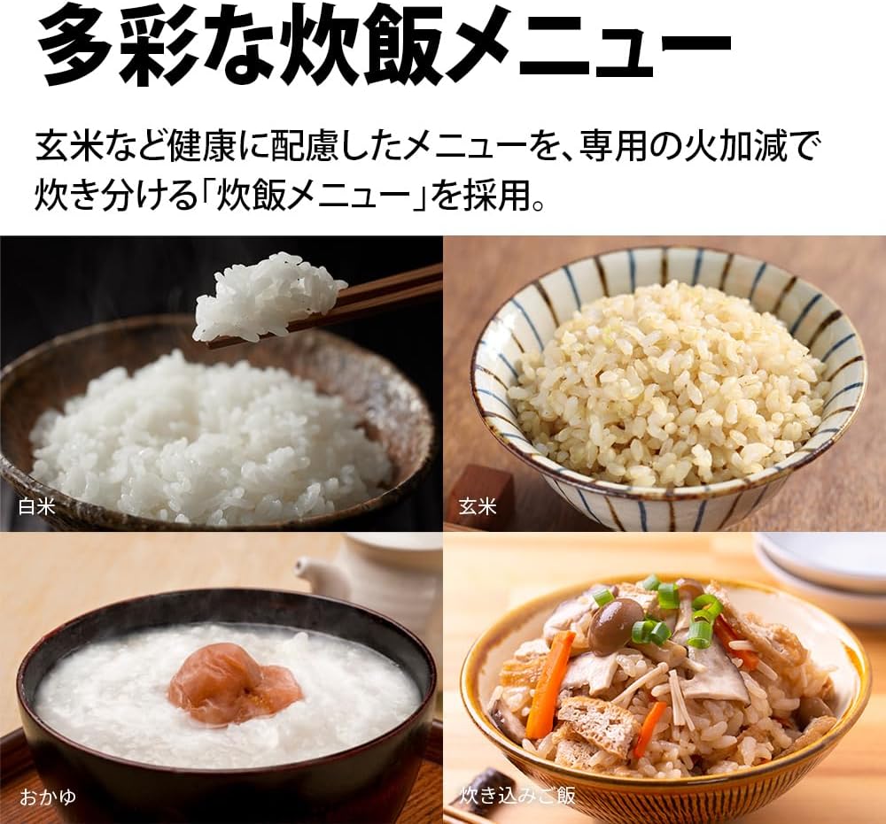 「黒厚釜」がお米の芯まで熱を伝え、底面を球状にした「球面炊き」でおいしく炊き上げます。