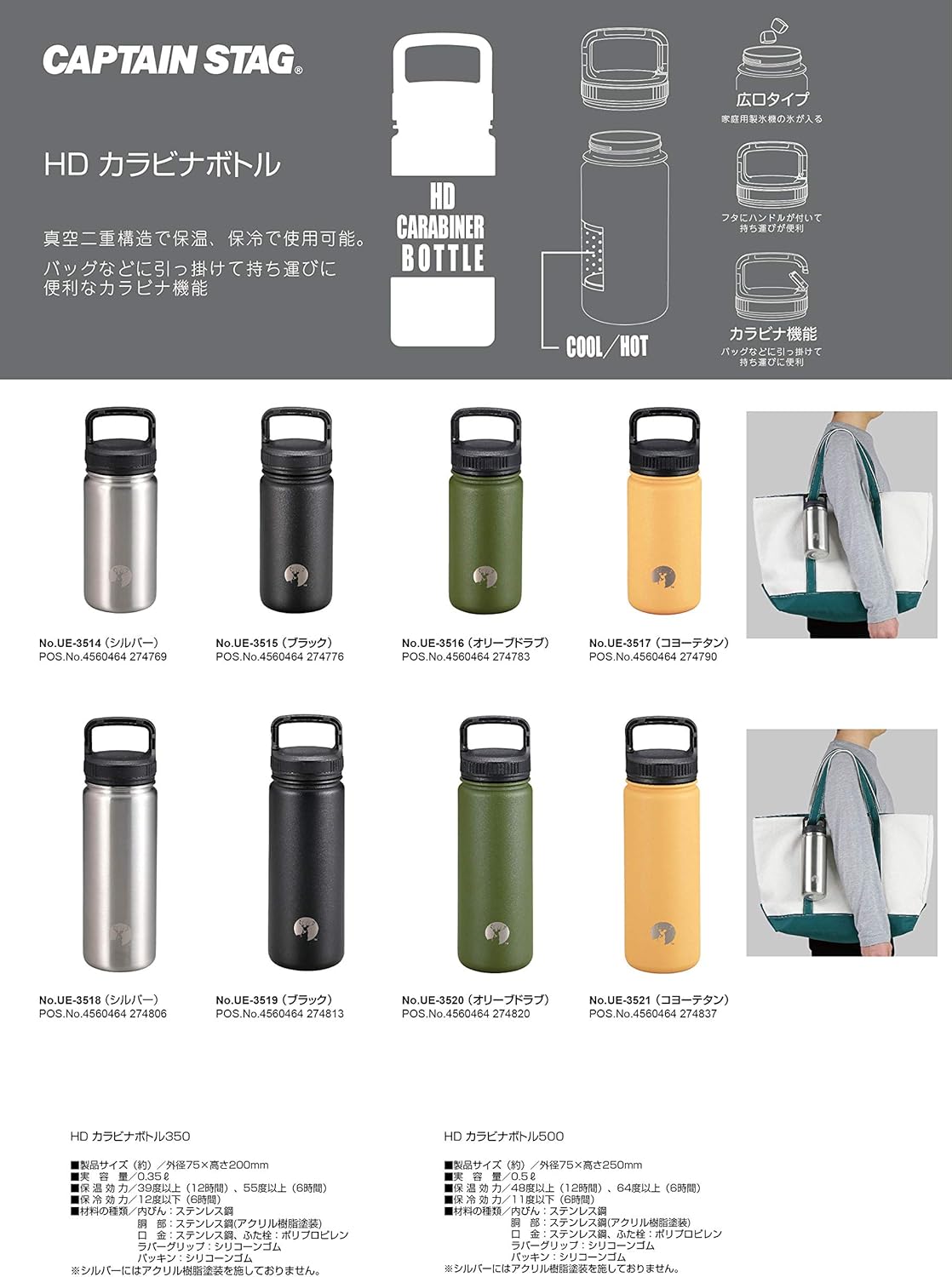 水筒 直飲み ダブルステンレスボトル 真空断熱 保温 保冷 HDカラビナボトル 500ml オリーブドラブ UE-3520