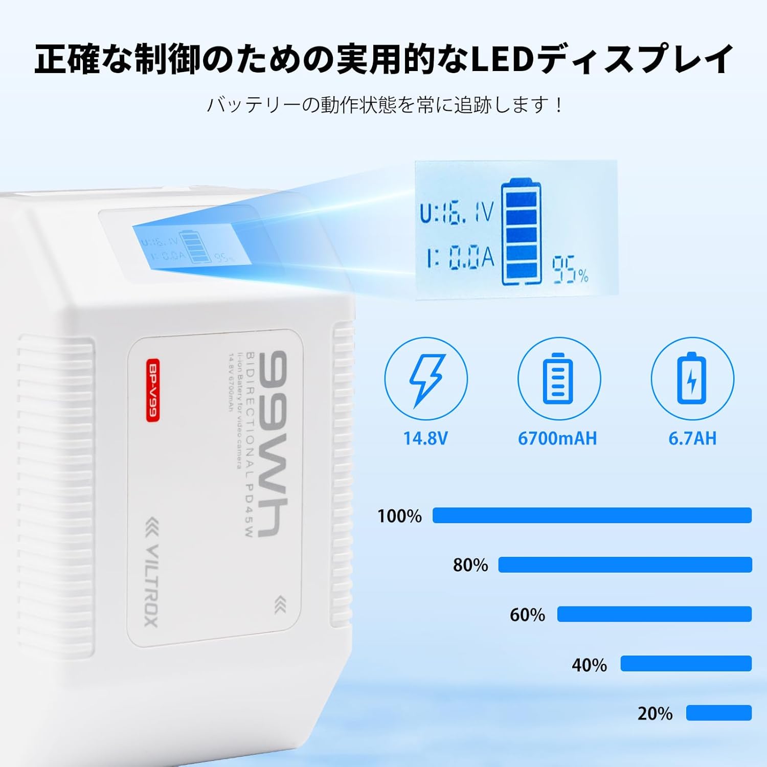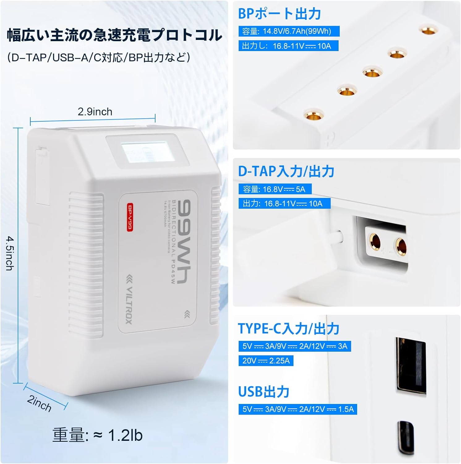 99Wh 6700mAh 14.8V出力 D-TAP/USB-A/C対応/BP出力 LEDディスプレイ