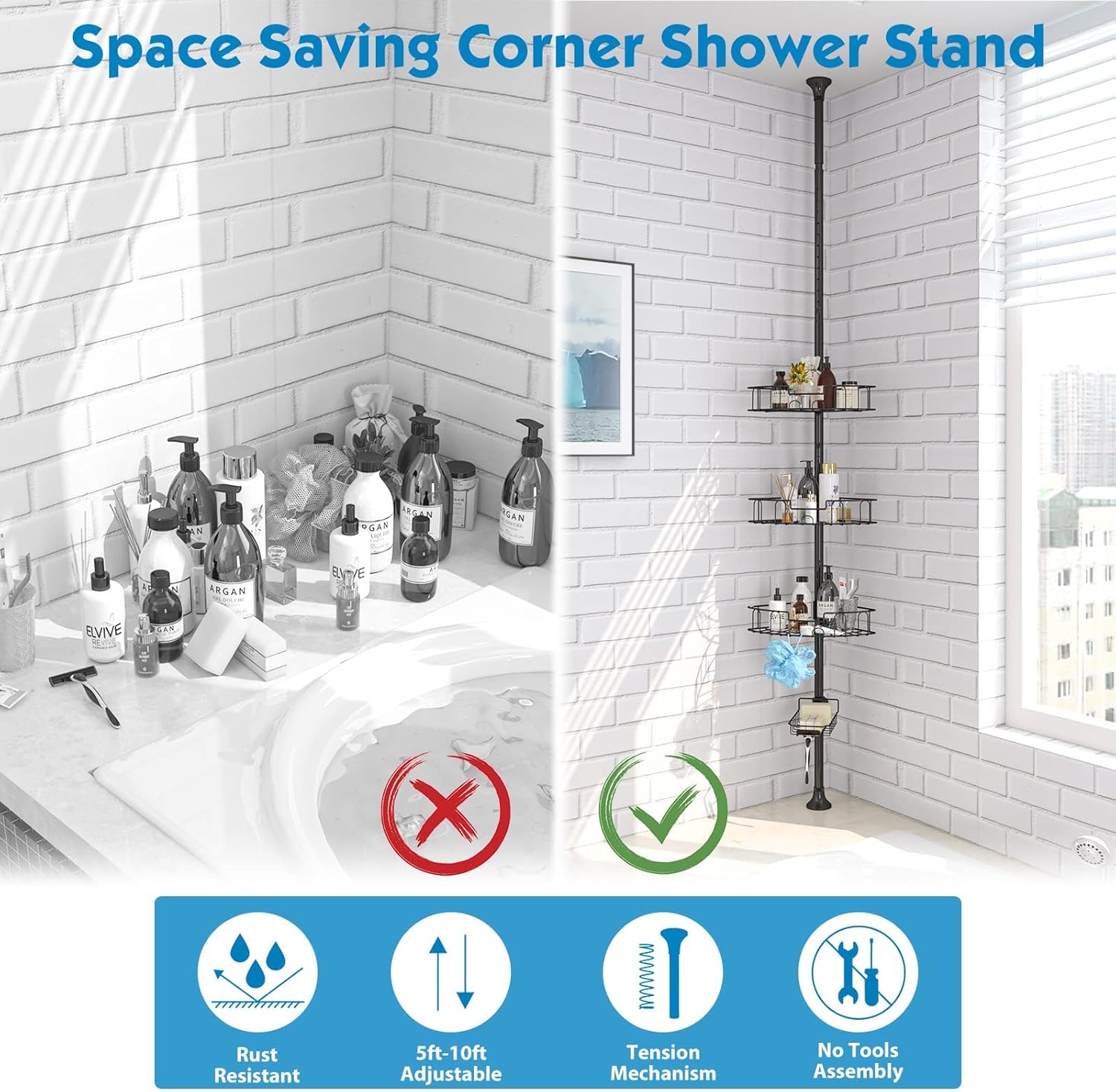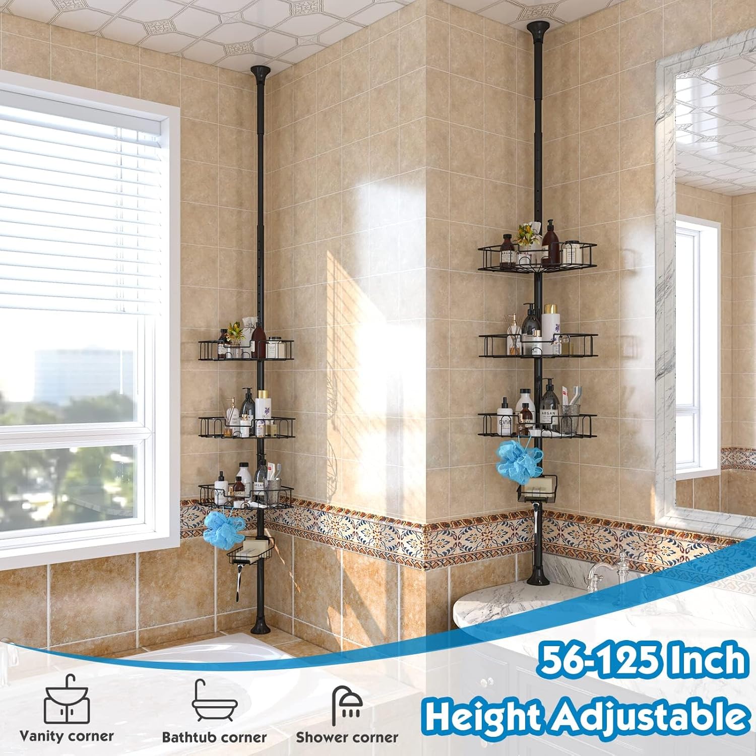 4つの調節可能なバスケット付き浴槽ロッカー, 97.5-312.5 cm ロッド付き浴室スタンド シャンプーを置く, 黒