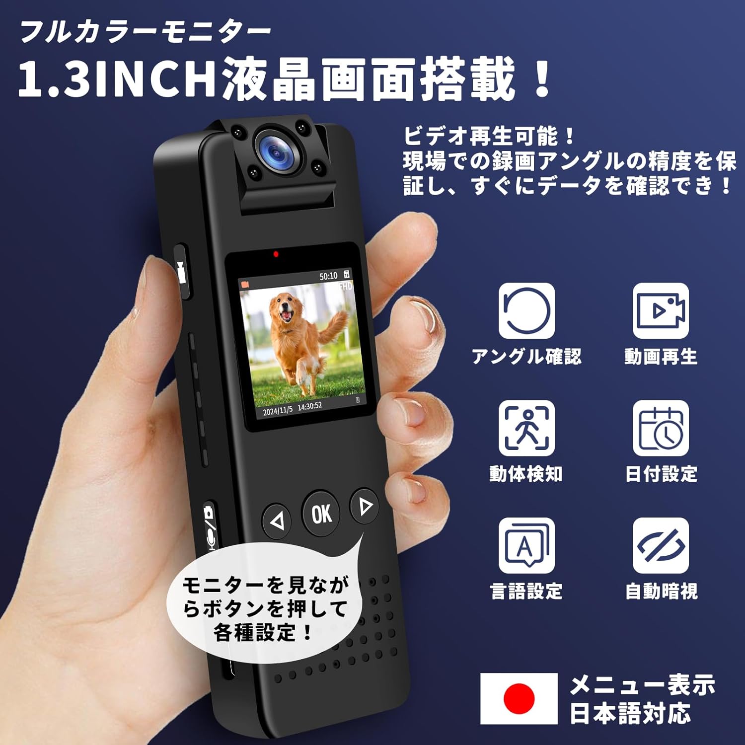 1.3インチのディスプレイ 搭載 本機で即時再生でき ビデオカメラ OTG機能搭載 ボディカメラ防犯カメラ LED暗視補正 180度可動式レンズ搭載 トレイルカメラ クリップ式カメラ 512GBまで対応 日本語説明書付き