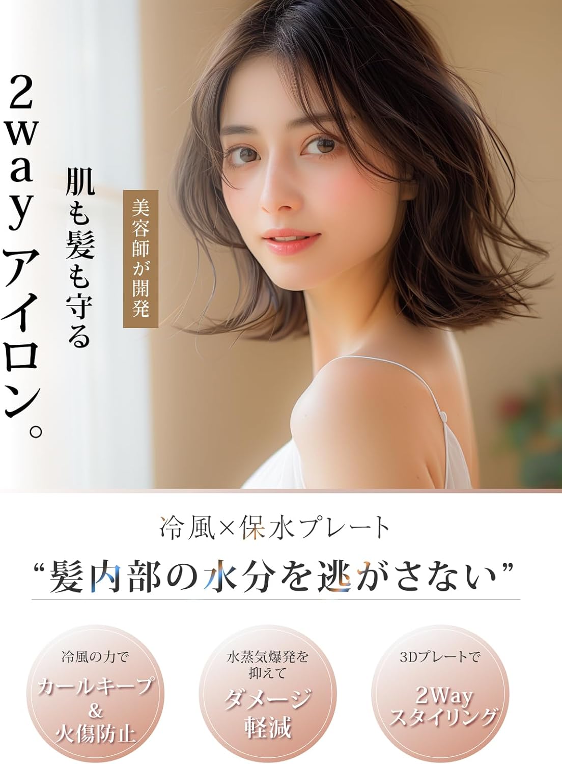 火傷ほぼゼロ設計 ヘアアイロン 2way 水蒸気爆発を起こしにくい MAX200℃