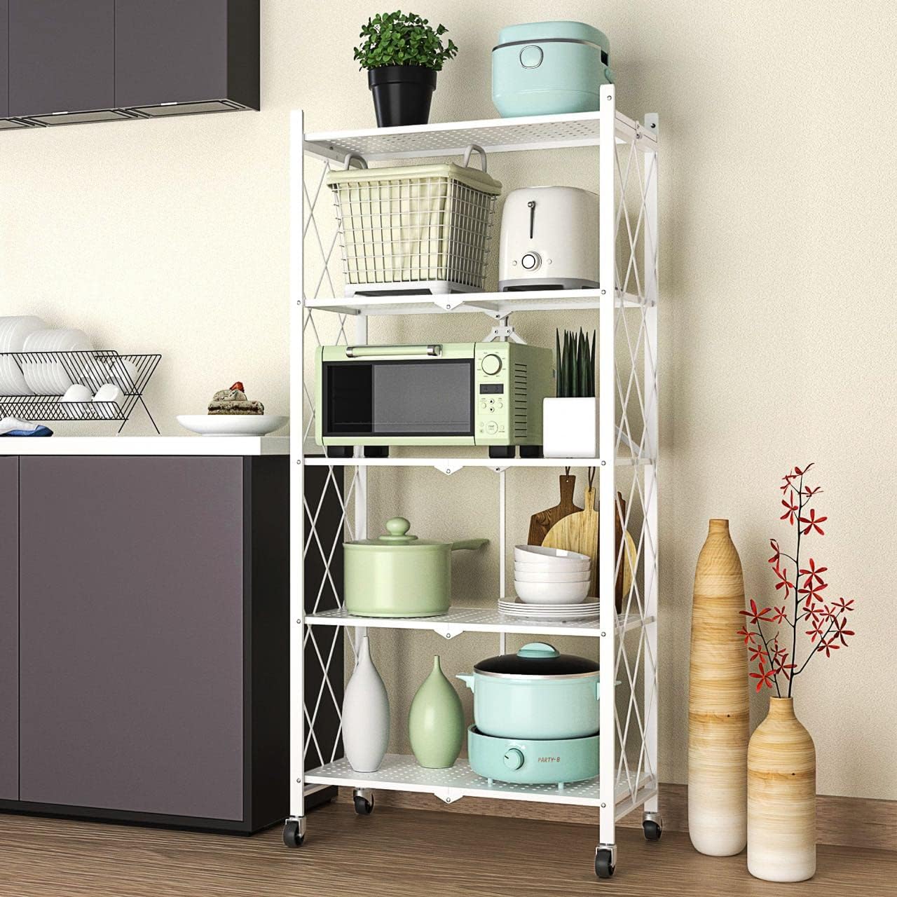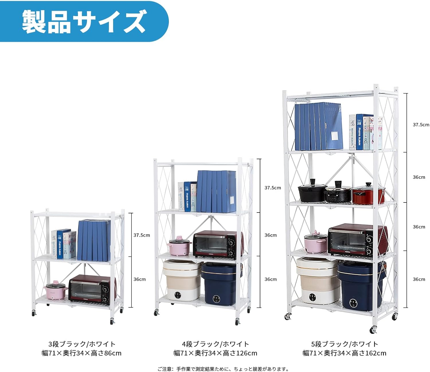 収納ラック キャスター付きメタルラック 折りたたみオープンラック キッチンラック シェルフ 移動便利 食器棚 防サビ加工 (ホワイト, 4段 幅71×奥行34×高さ126cm)
