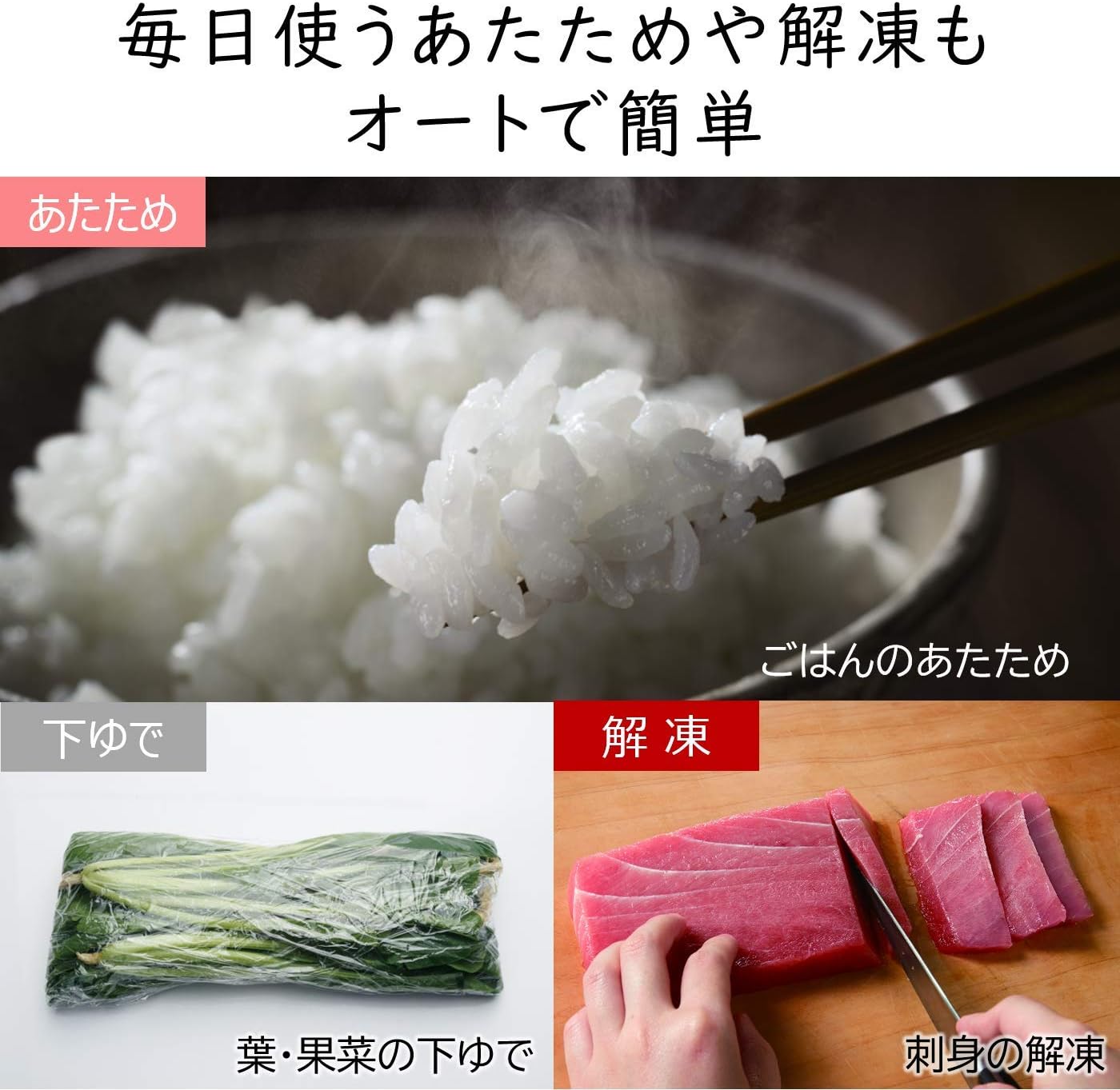 「牛乳」「野菜下ゆで」「解凍」などがオートで簡単。あたためから解凍まで幅広くお使いいただけます