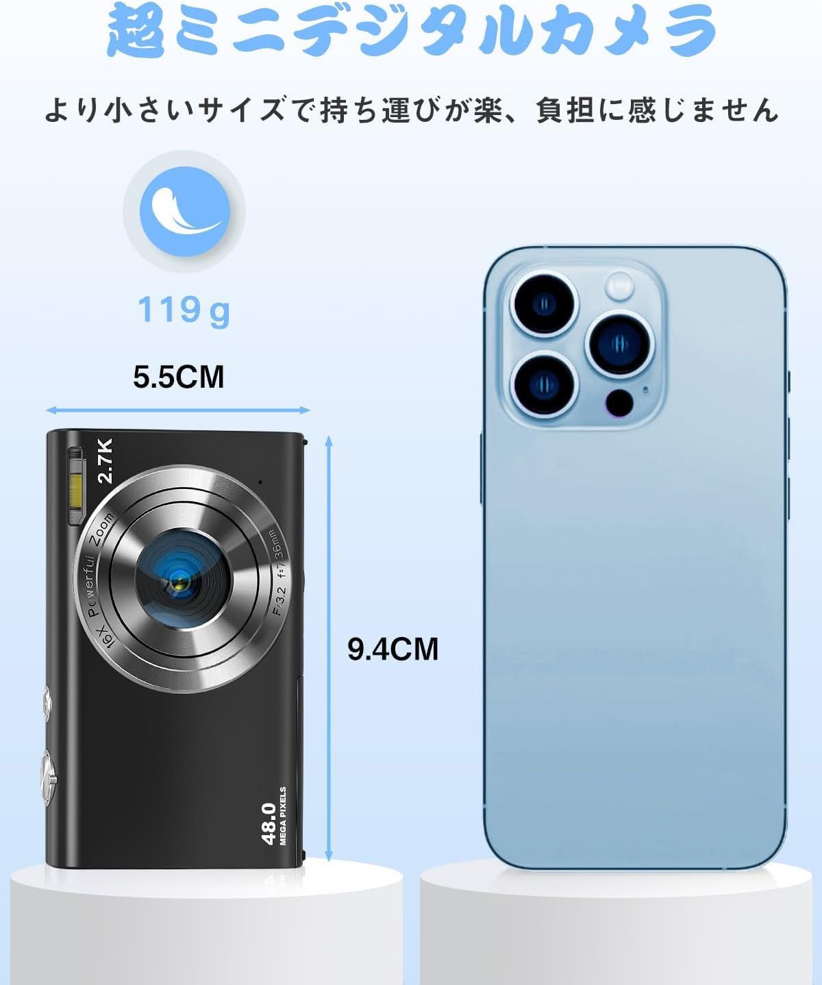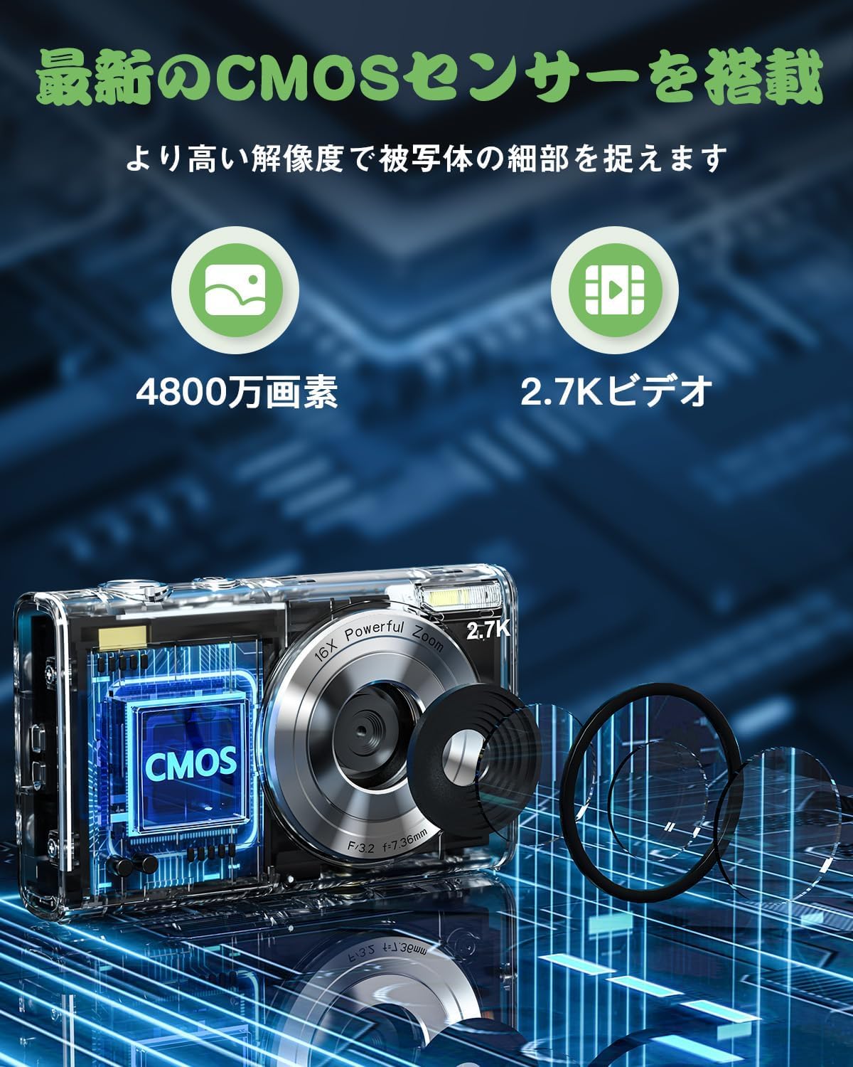 オートフォーカス 4800万画素 4K解像度 近接撮影 16倍デジタルズーム 2.8インチ大画面 予備電池 軽量 修学旅行 学生 初心者 ブラック