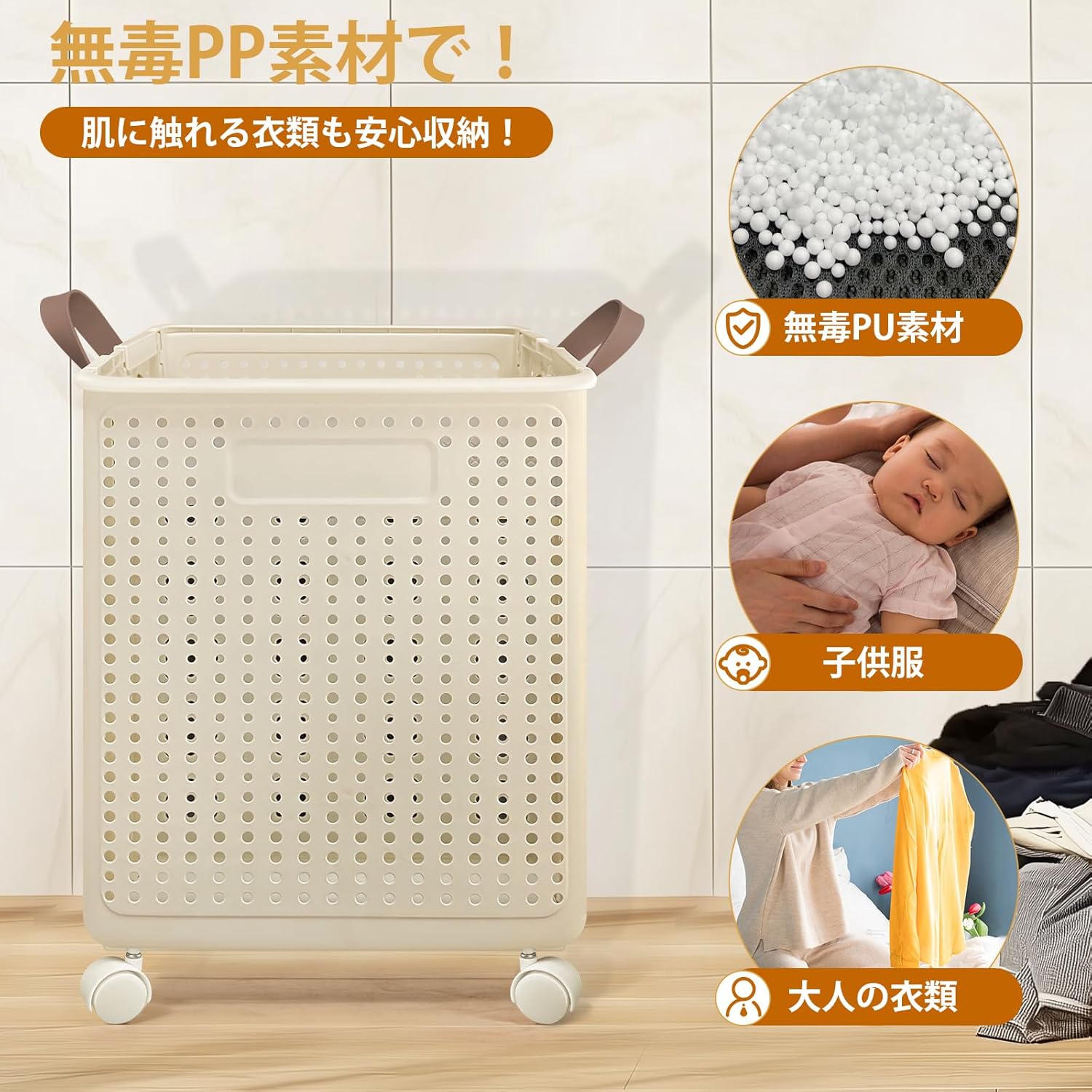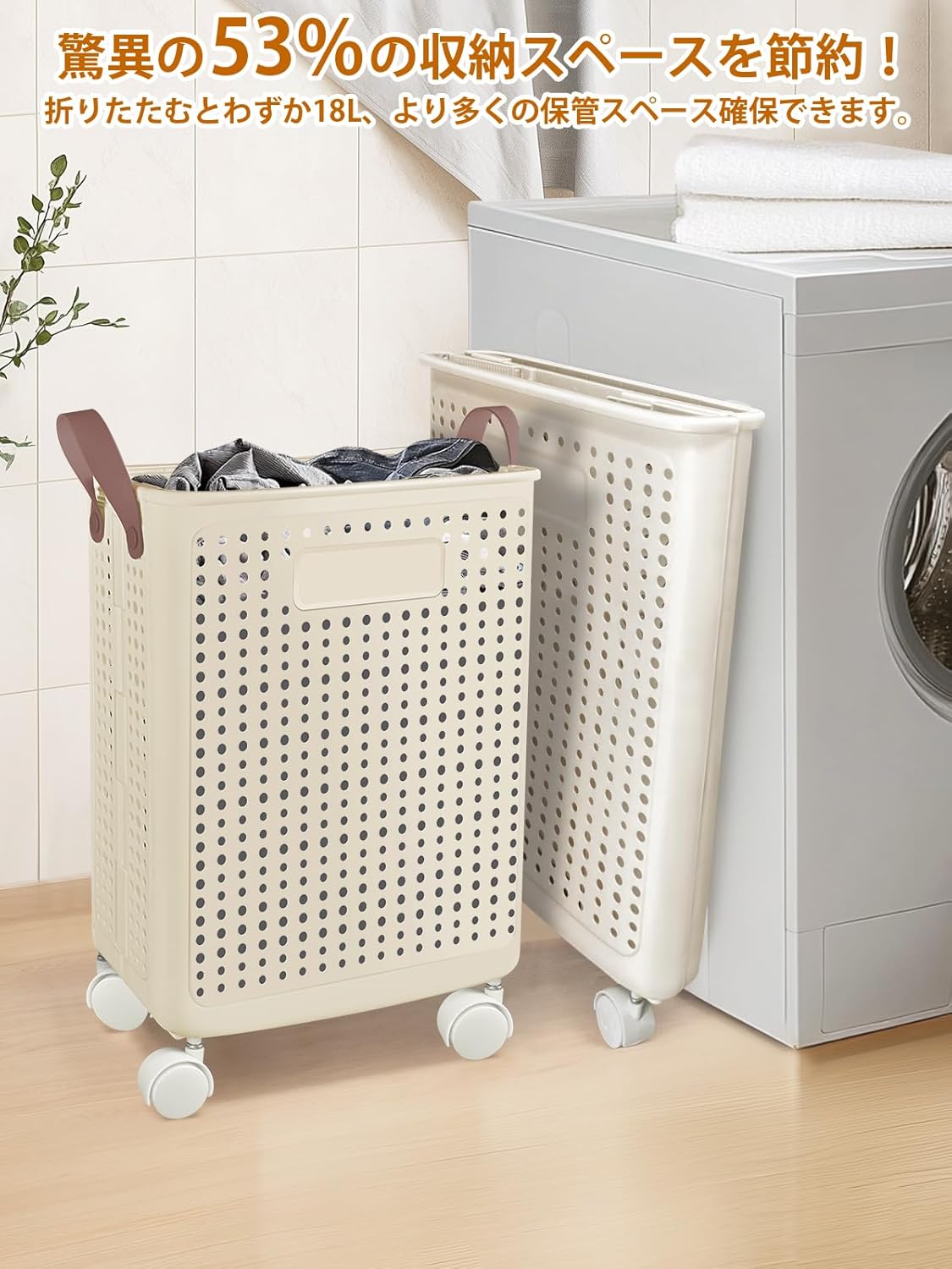 折り畳み スリム 洗濯カゴ 折りたたみ 洗濯籠 折畳み キャスター付き 取っ手付き 大容量 ランドリーボックス 洗濯物入れ 高強度無毒PP素材&折り畳みで66%省スペース 53L-37.7*31*45.4cm