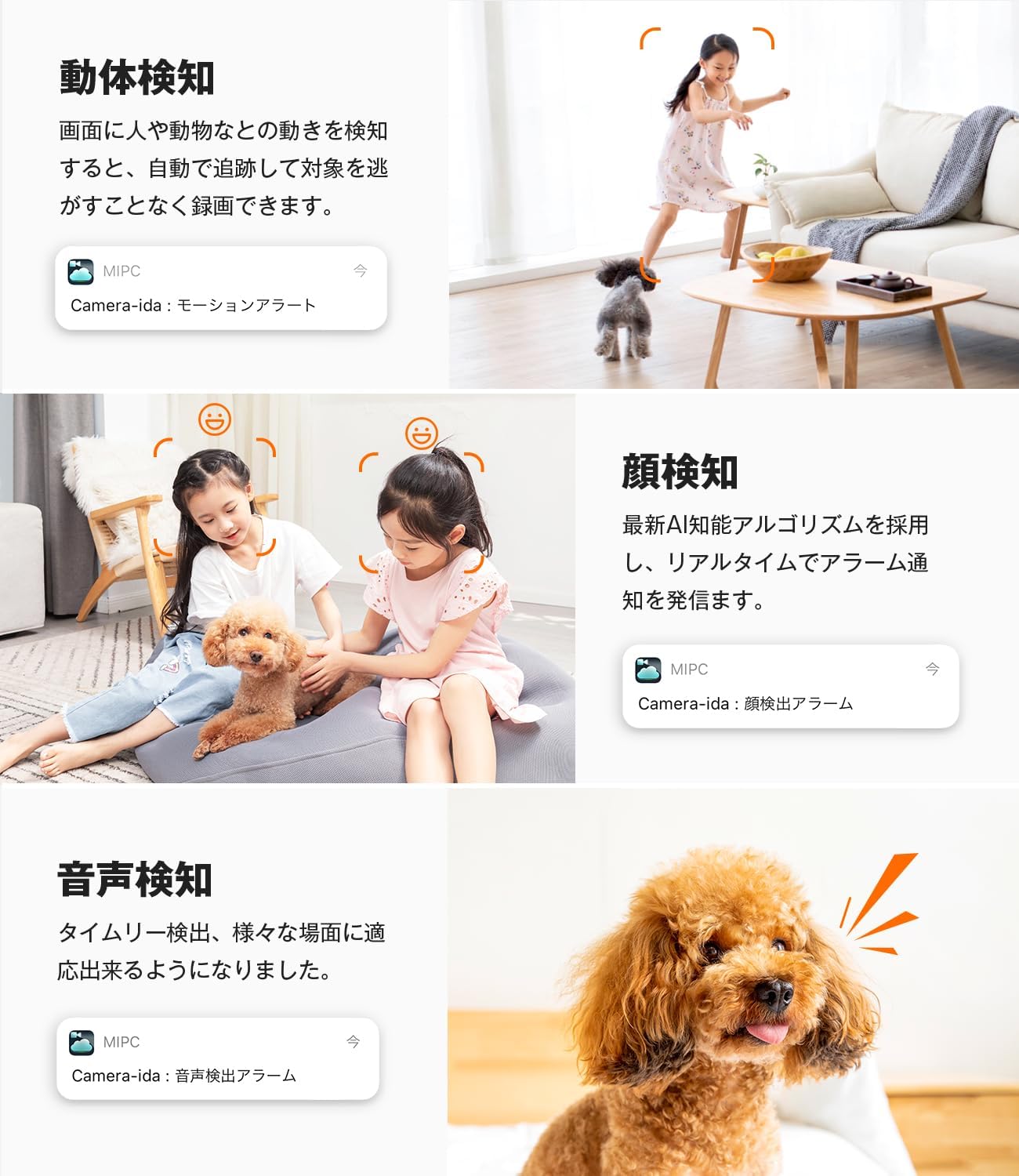 AI知能見守りカメラ 夜間撮影 防犯カメラ 室内 360°全方位監視カメラ iphone対応 24時間録画 ネットワークカメラ ワイヤレス 超広角 遠隔スマホ ベビーモニター留守番双方向音声 自動追尾 警報通知 猫/犬/子供/老人/赤ちゃん 技適認証済み iOS/Android/alexa対応