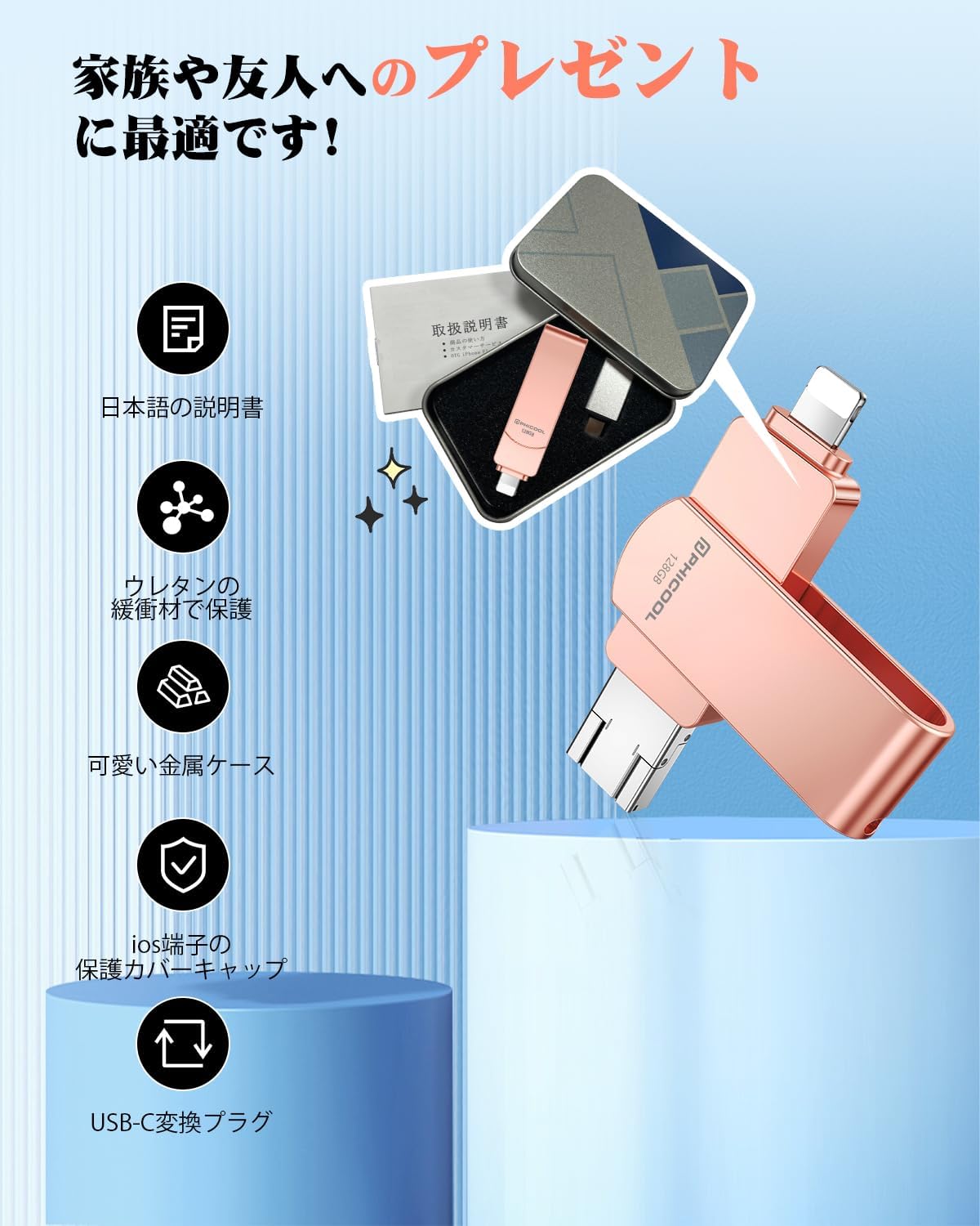 フラッシュメモリ IOS/Android/PC USB高速 4 in1 Phone usbメモリ スマホ usbメモリphone バックアップ usbメモリ タイプc usbメモリ 外付けusbメモリー 容量不足解消写真沢山撮る人に必要なusbメモリ! (ピンク, アプリ不要 128GB)