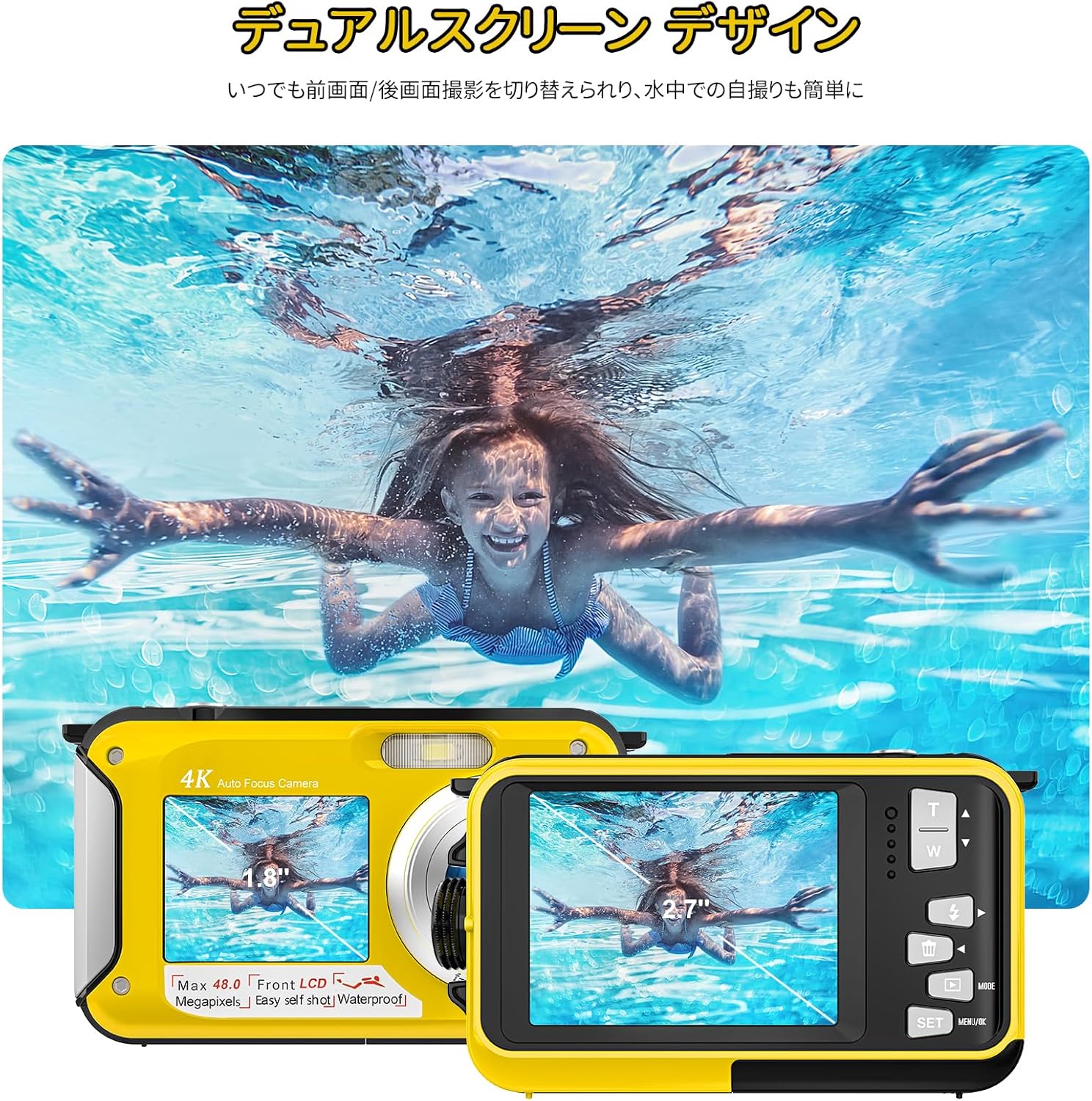 ケース不要 水中カメラ デュアルスクリーン 自撮可能 操作簡単 防水 軽量 コンパクト 32GB Micro SDカード付属 バッテリー付き 5600万画素