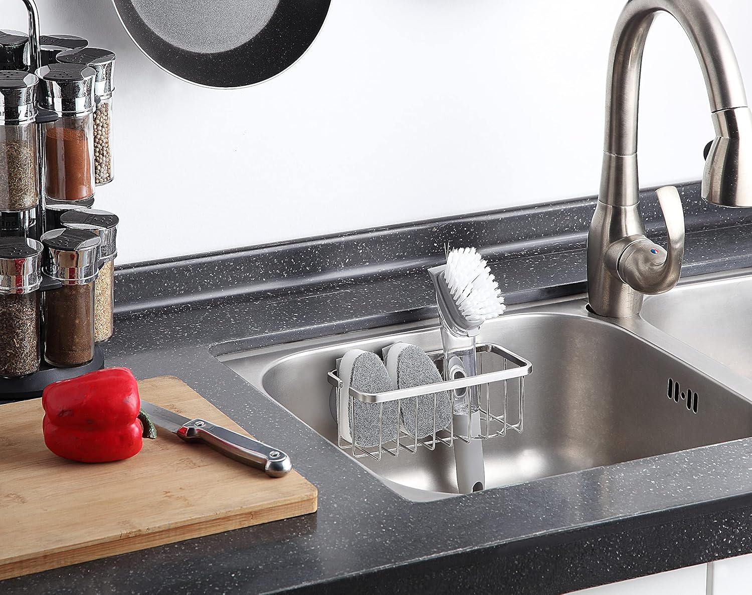 大きめ丈夫な キッチンシンク用・お風呂用 スポンジホルダー吸盤付き (予備粘着フィルムフック 1個付) (シルバー, ステンレス鋼)