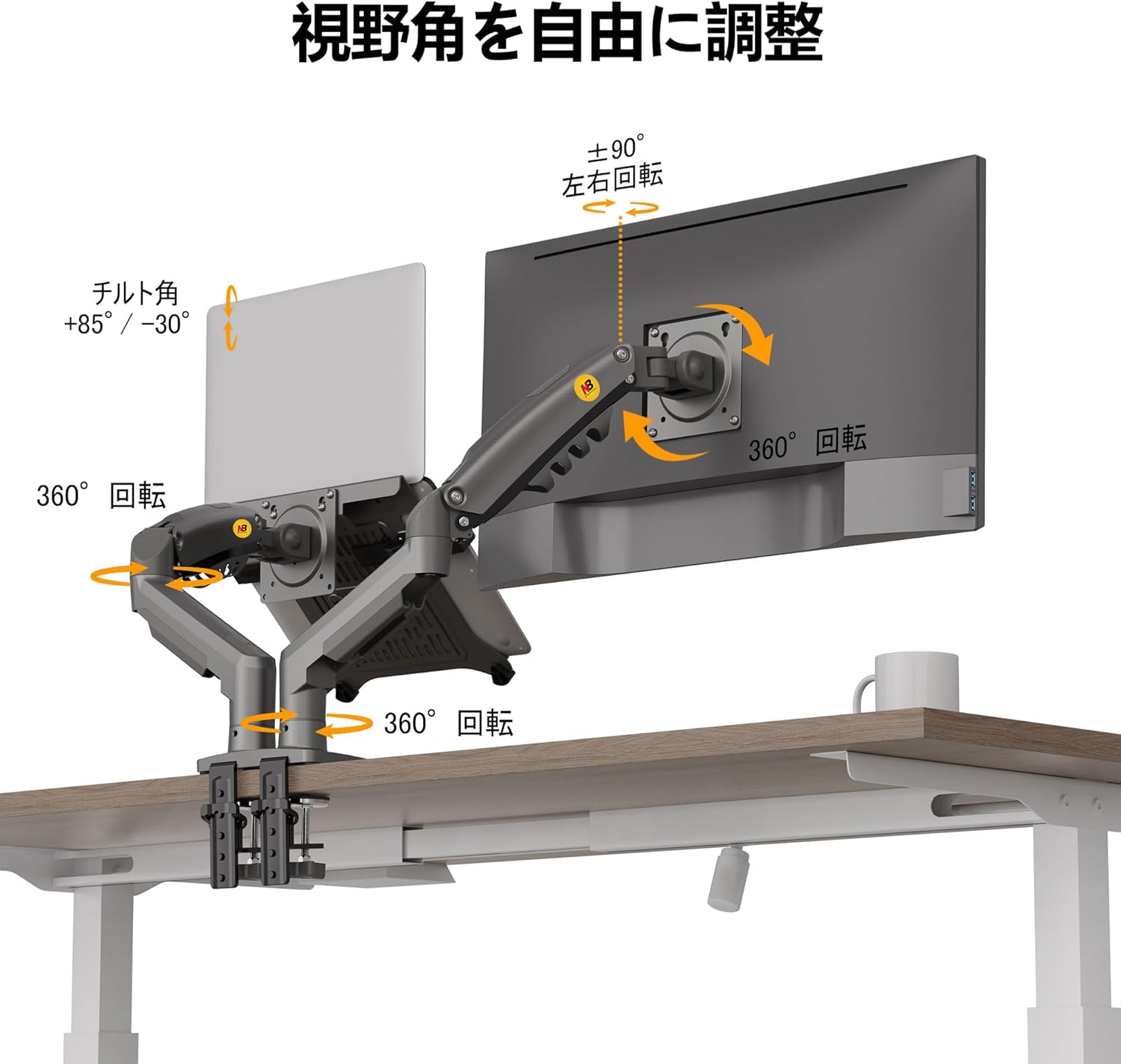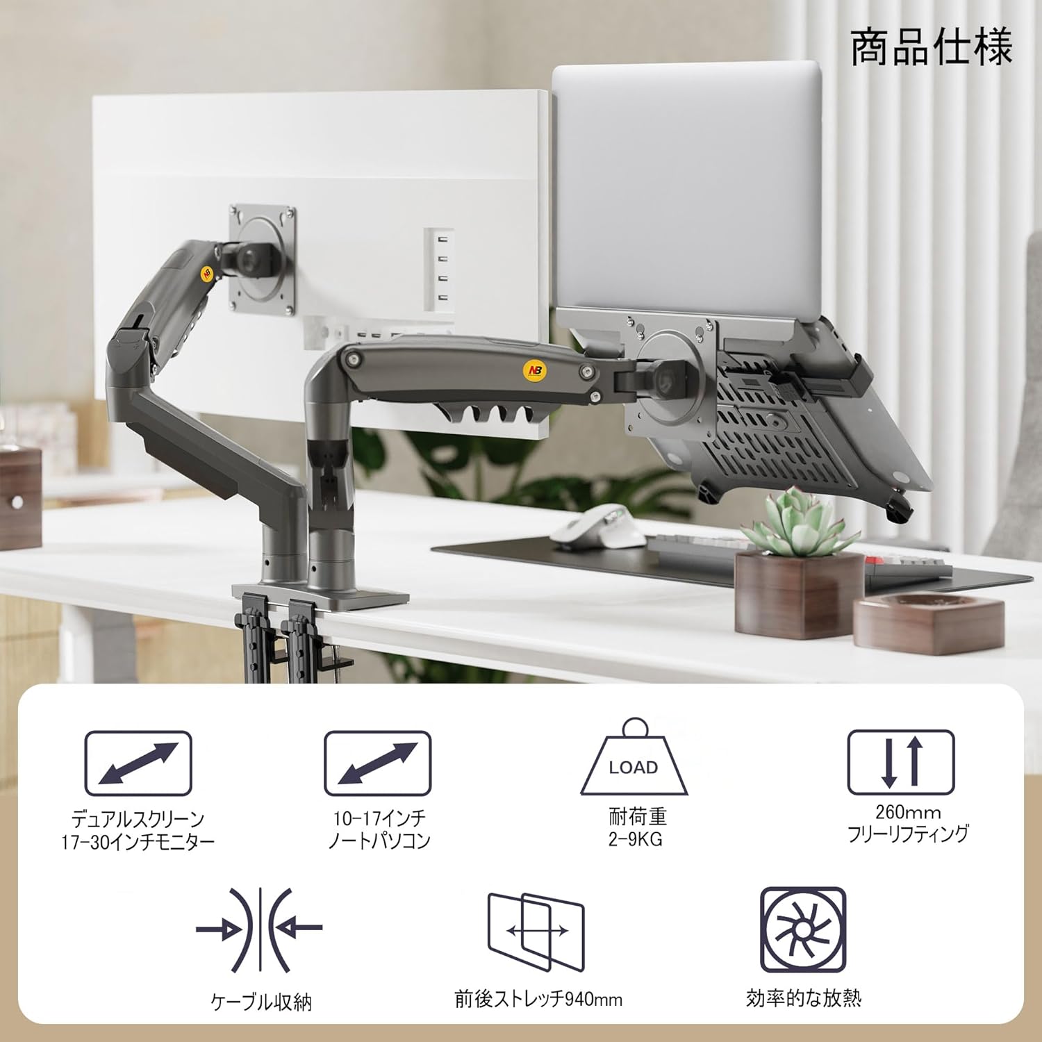 モニターアーム 17-30モニター対応 10-17インチパソコン対応 2in1 耐荷重2-9KG 2画面 デュアルディスプレイアーム