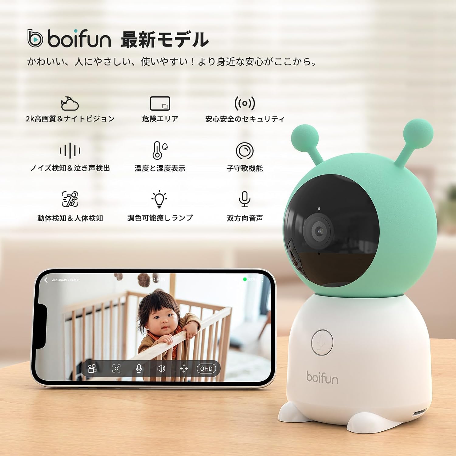 ベビーセンサー 300万画素暗視 常時録画 360°自動追跡 双方向通話 人体検知 危険エリア アラーム 屋内留守番カメラ 子守唄 授乳ライト 高齢者 新生児 出産祝い BOIFUNメーカー2年保証