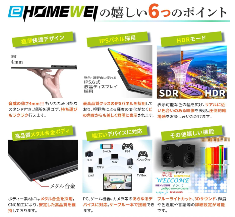 EHOMEWEI モバイルモニター 15.6インチ FHD 1920x1080 タッチパネル タッチペン対応 筆圧4096段階 薄さ 4mm 保護フィルム E156DSL