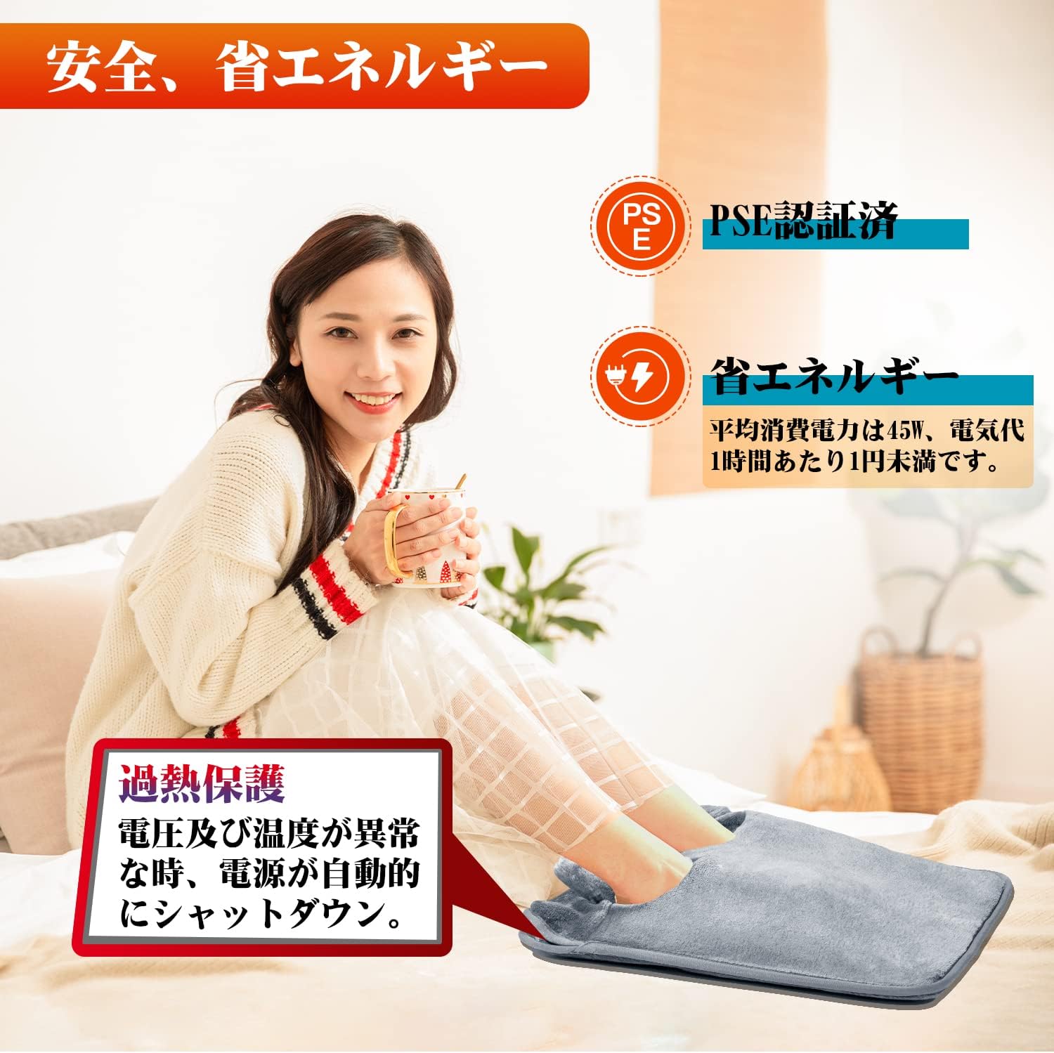 70°Cまで ホットフットヒーター 過熱保護 タイマー機能