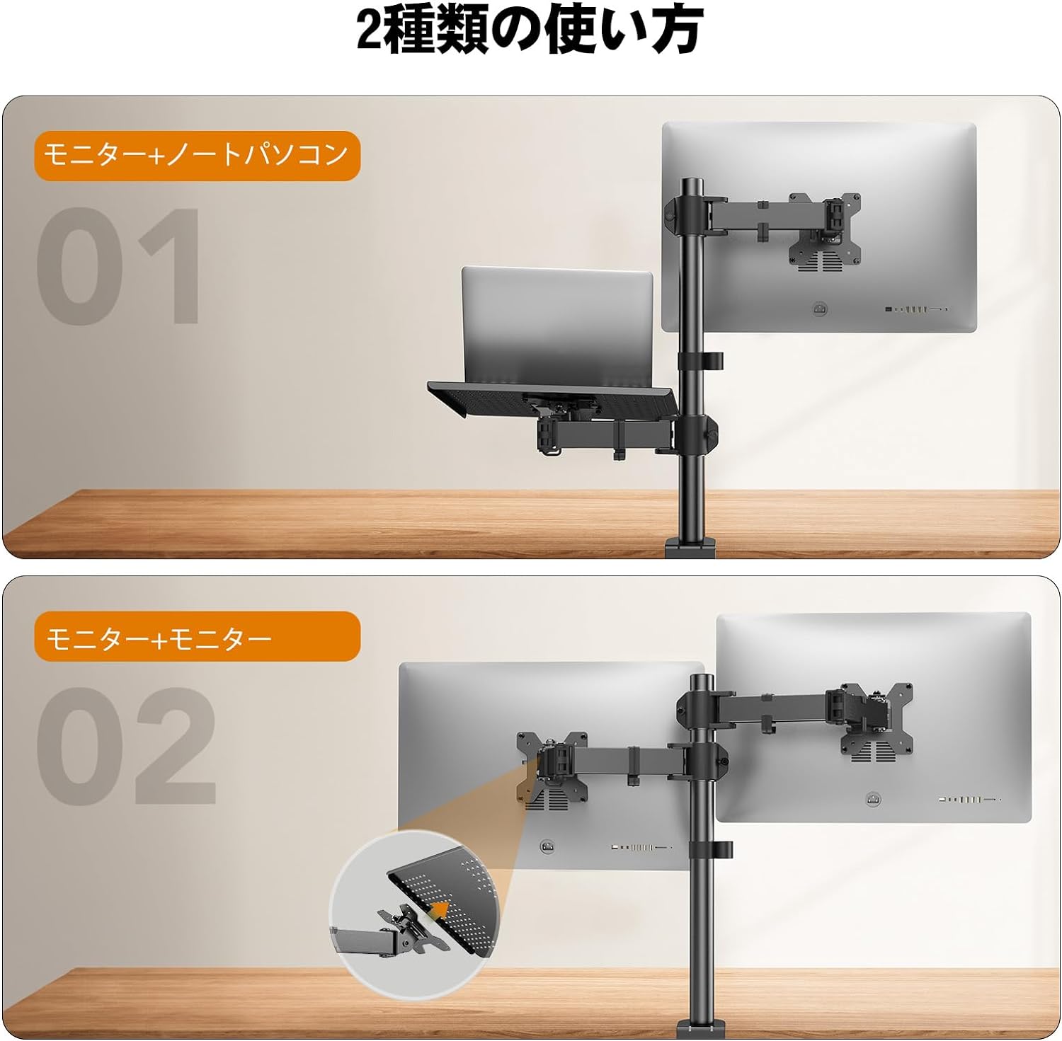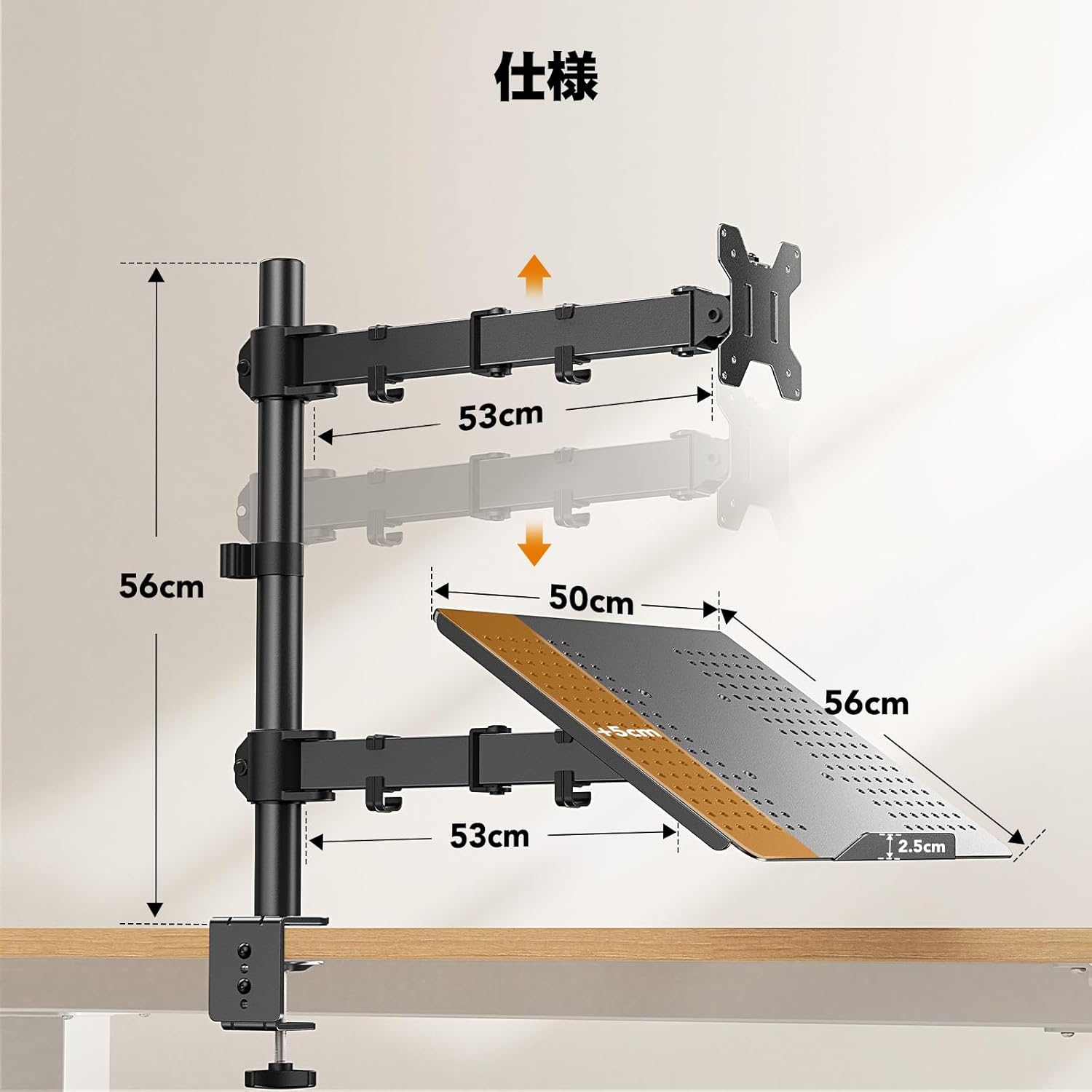 ノートパソコン アーム 2in1 デュアル 13〜27インチ対応 耐荷重10kg 15.6インチまで ディスプレイアーム トレイ付き