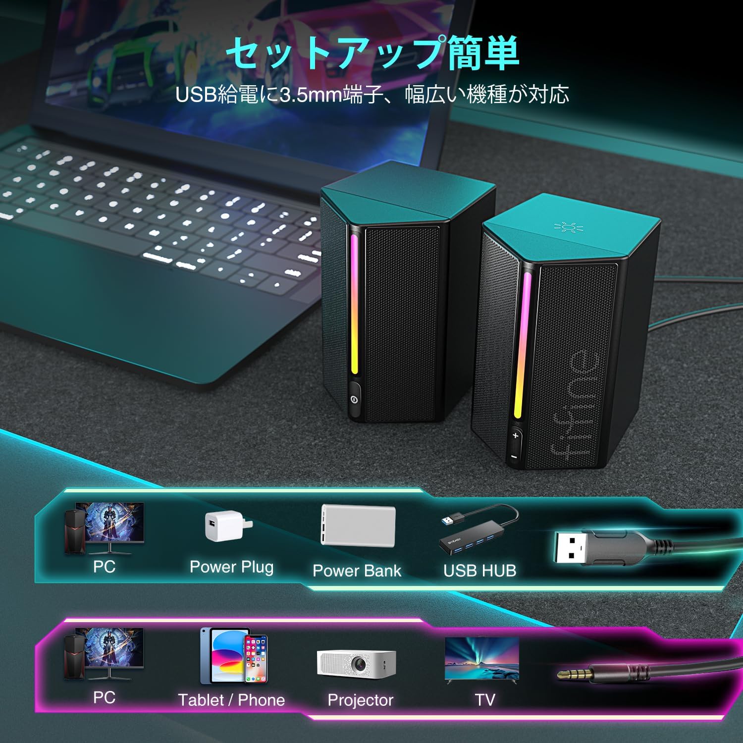有線 3.5mm接続 ステレオスピーカー 重低音 RGBライト制御可能 USB給電 PC