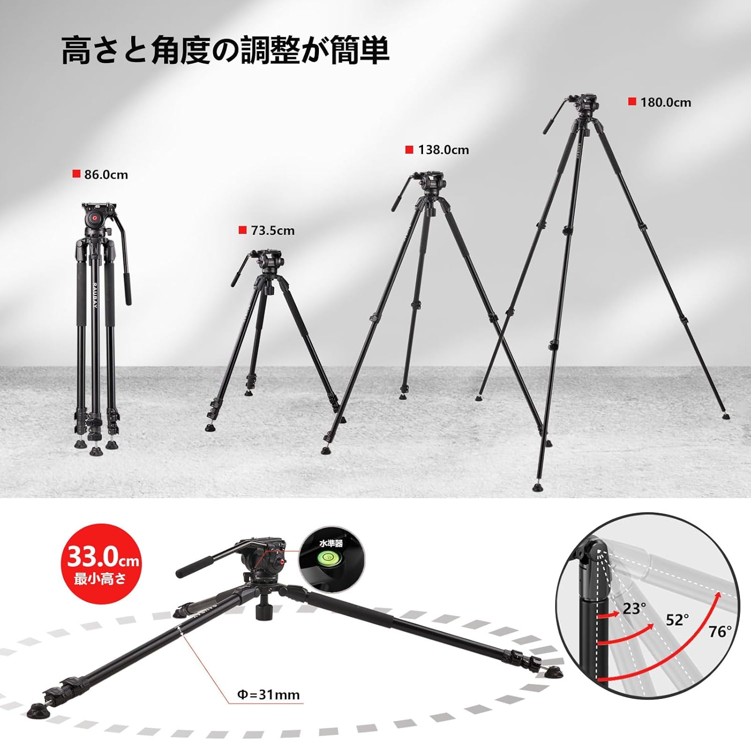 360°パン&165°チルト流体ヘッド付き頑丈な三脚スタンド、75mmボウルベース