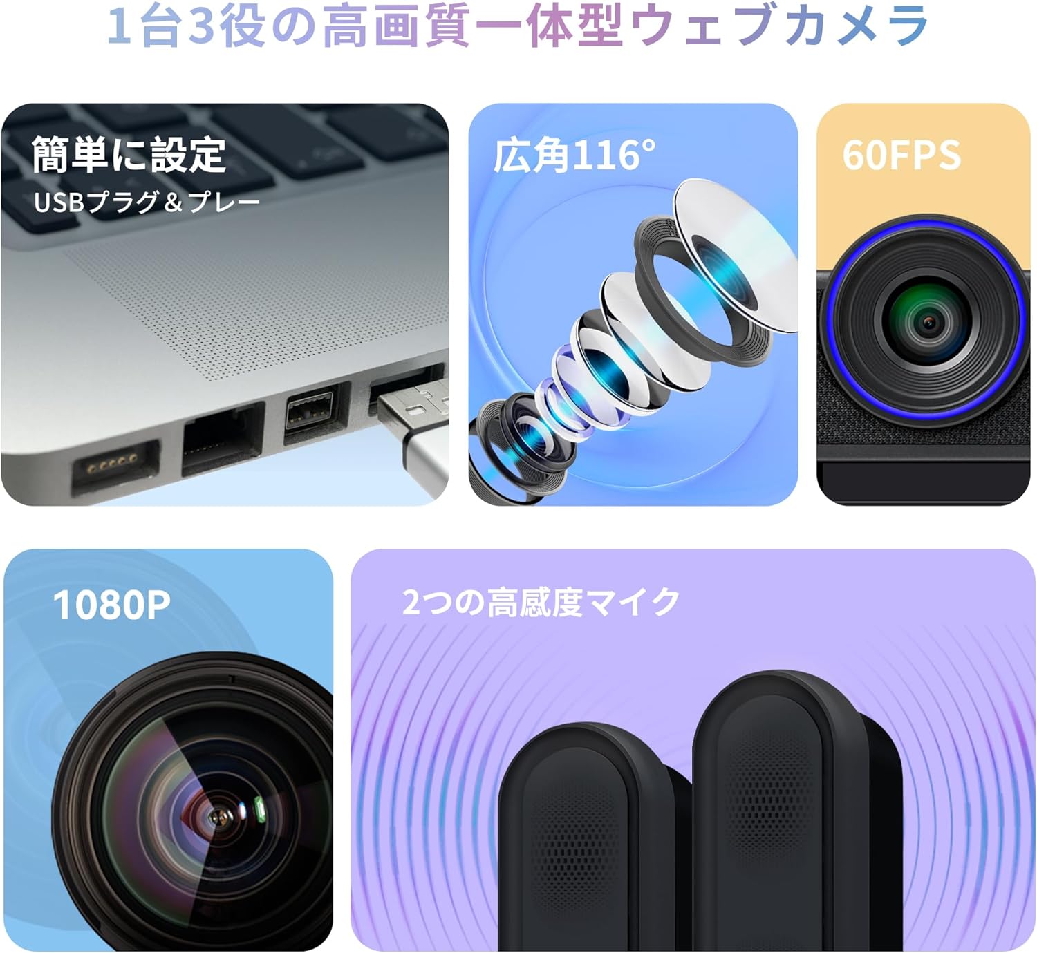 60fps マイク スピーカー内蔵 HD1080P PC USB 広角116°Facecamノイズ低減とエコーキャンセル